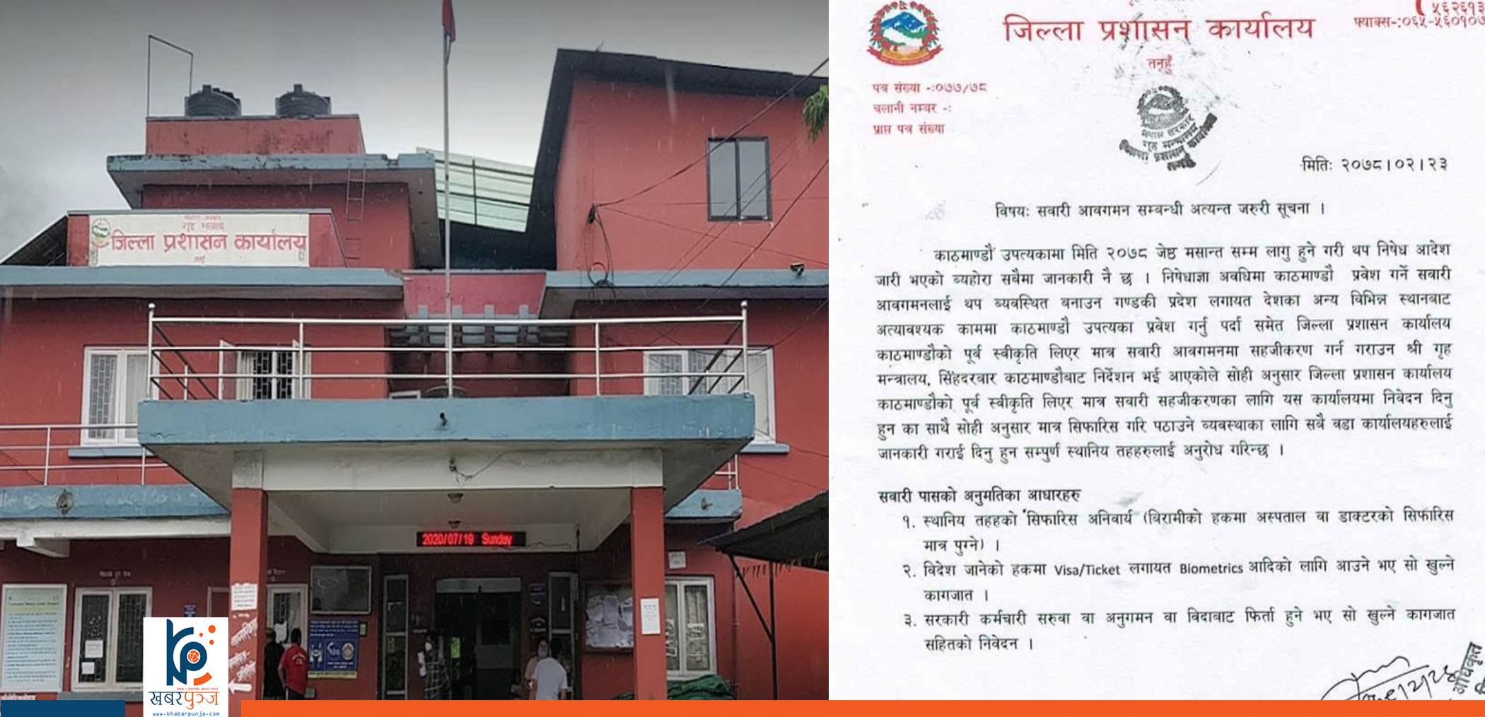निषेधाज्ञा अवधिमा काठमाडौ प्रवेश गर्ने सवारी आवगमनलाई थप व्यवस्थित बनाउन गण्डकी प्रदेश लगायतका देशका अन्य विभिन्न स्थानबाट अत्यावश्यक काममा काठमाडौ प्रवेश गर्नुपर्दा जिल्ला प्रशासन कार्यालय काठमाडौको पूर्व स्वीकृत लिएर मात्र सवारी आवगमनमा सहजीकरण गर्न गृह मन्त्रालयले निर्देशन दिएको छ ।
