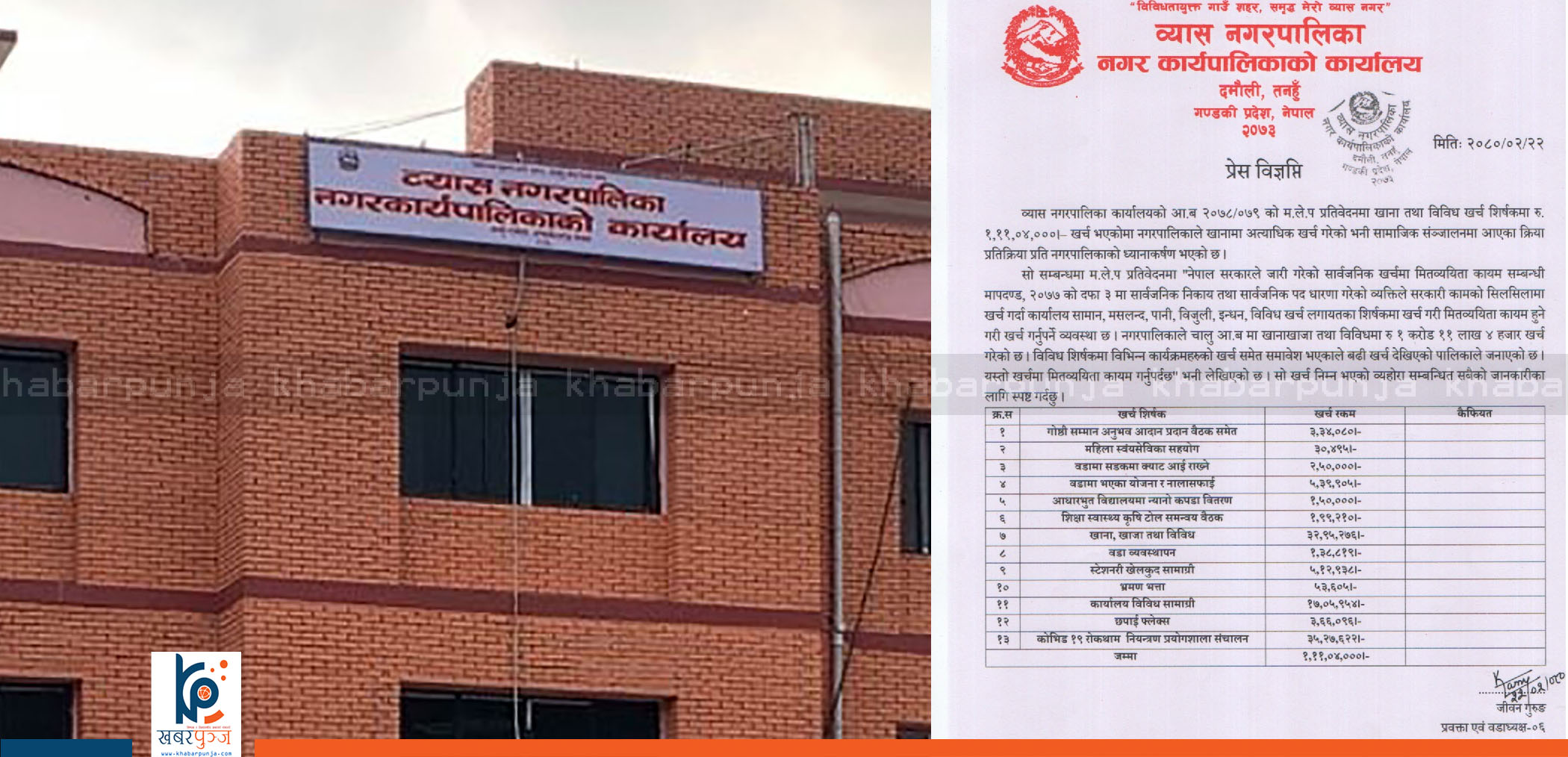 दमाैली । तनहुँको व्यास नगरपालिकाले खाना तथा खाजामा एक करोड भन्दा बढी खर्च भएको समाचार सार्वजनिक भएपछि प्रष्टिकरण दिएको छ । महालेखा परीक्षकको कार्यालयले सार्वजनिक गरेको आर्थिक वर्ष २०७८/७९ को प्रतिवेदनमा खाना खाजा तथा विविध शीर्षकमा रु एक करोड ११ लाख चार हजार खर्च भएको सार्वजनिक भएपछि नगरपालिकाले सोमबार विज्ञप्ती जारी गरी प्रष्टिकरण दिएको हो ।