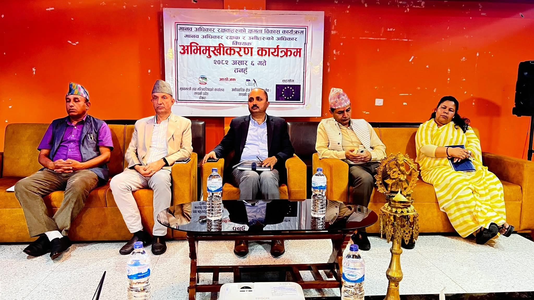 दमौली, ६ असोज । मानवअधिकार रक्षा र प्रत्याभूतिका लागि सबै प्रतिबद्ध हुनुपर्नेमा तनहुँमा आयोजित कार्यक्रमका वक्ताहरुले जोड दिएका छन् । मुख्यमन्त्री तथा मन्त्रिपरिषद्को कार्यालयको सहयोग र अनौपचारिक क्षेत्र सेवा केन्द्र इन्सेकको आयोजनामा शुक्रबार तनहुँको बन्दीपुरमा आयोजित मानवअधिकार रक्षकहरुको क्षमता विकास अभिमुखीकरण कार्यक्रमका वक्ताहरुले मानव अधिकार संरक्षण सबैको कर्तव्य भएको बताए ।