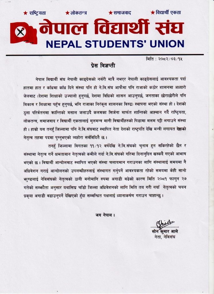तनहुँ जिल्लामा विगतका ११/१२ वर्षदेखि नेविसंघको चुनाव नभएको र संस्थामा नेतृत्व गर्ने क्षमतावान नेतृत्वको कमीले गर्दा नेविसंघको गरिमा दिनानुदिन खस्कदै गएको आभाष भएको उनले उल्लेख गरे । उनले भने, ‘विद्यार्थी आन्दोलनबाट स्थापित भएको संस्था चलायमान गराउनका लागि संस्थालाई समयमा नै अधिवेशन गराई आन्दोलनको उपलब्धीहरुलाई संस्थागत गर्नुपर्ने आवश्यकता रहेको समयमा केही सानो झुण्डलाई नेविसंघको नेतृत्वको ठानी मनोमानी रुपमा अगाडी बढेको कारण यथाशीघ्र अधिवेशन हुनुपर्छ ।’