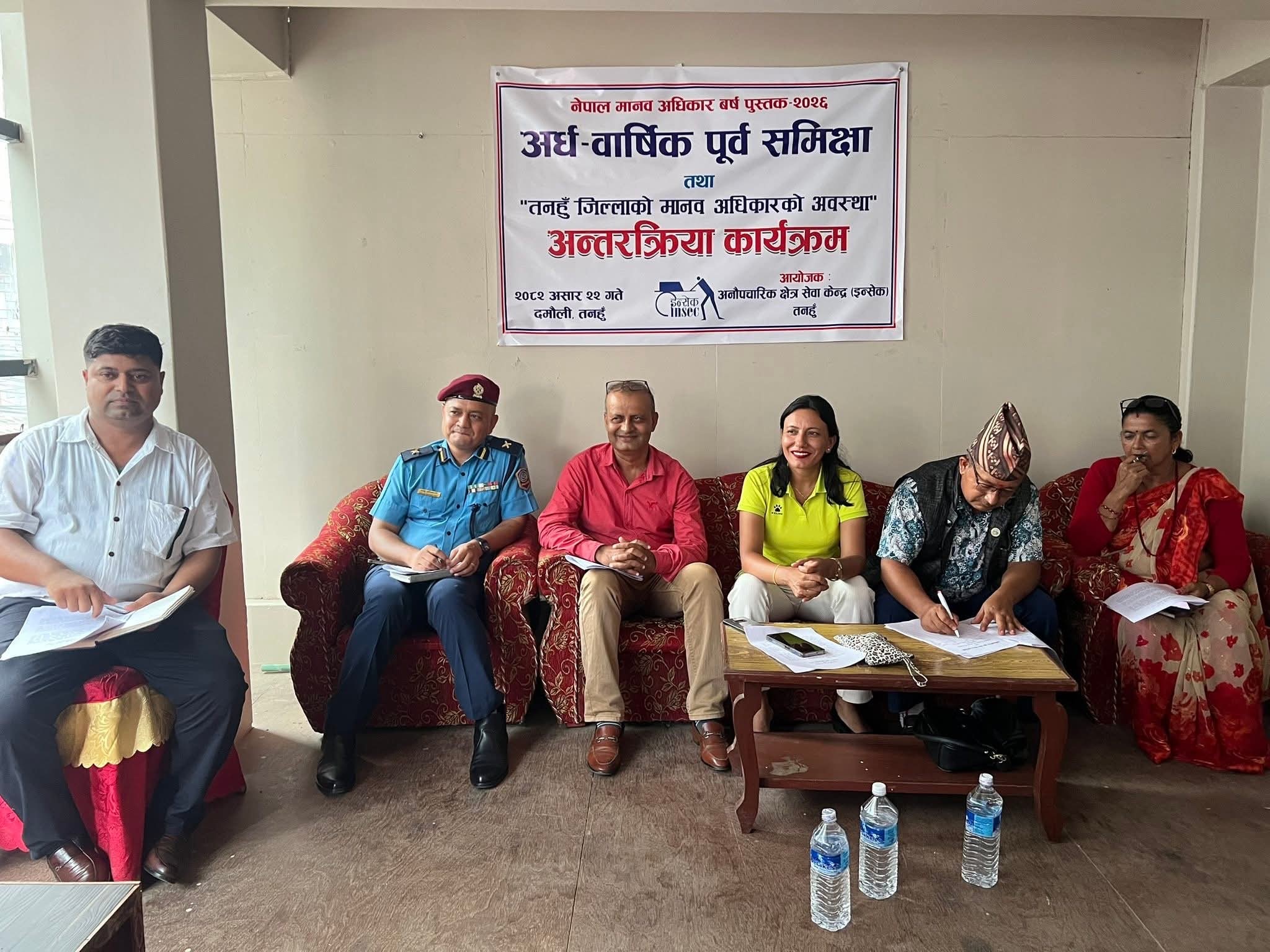दमौली, २२ असार । अनौपचारिक क्षेत्र सेवा केन्द्र (इन्सेक) तनहुँको आयोजनामा नेपाल मानव अधिकार वर्ष पुस्तक–२०२६ को लागि सङ्कलित घटनाहरुको अर्धवार्षिक पुर्व समीक्षा तथा तनहुँ जिल्लाको मानव अधिकारको अवस्थाको बारेमा अन्तरक्रिया कार्यक्रम आइतबार दमौलीमा सम्पन्न भयो । मानवअधिकार वर्ष पुस्तकको लागि सङ्कलित घटनाहरुको बारेमा सरोकारवाला निकायको सुझाव सङ्कलन गर्ने उद्देश्यले आयोजना गरिएको थियो ।