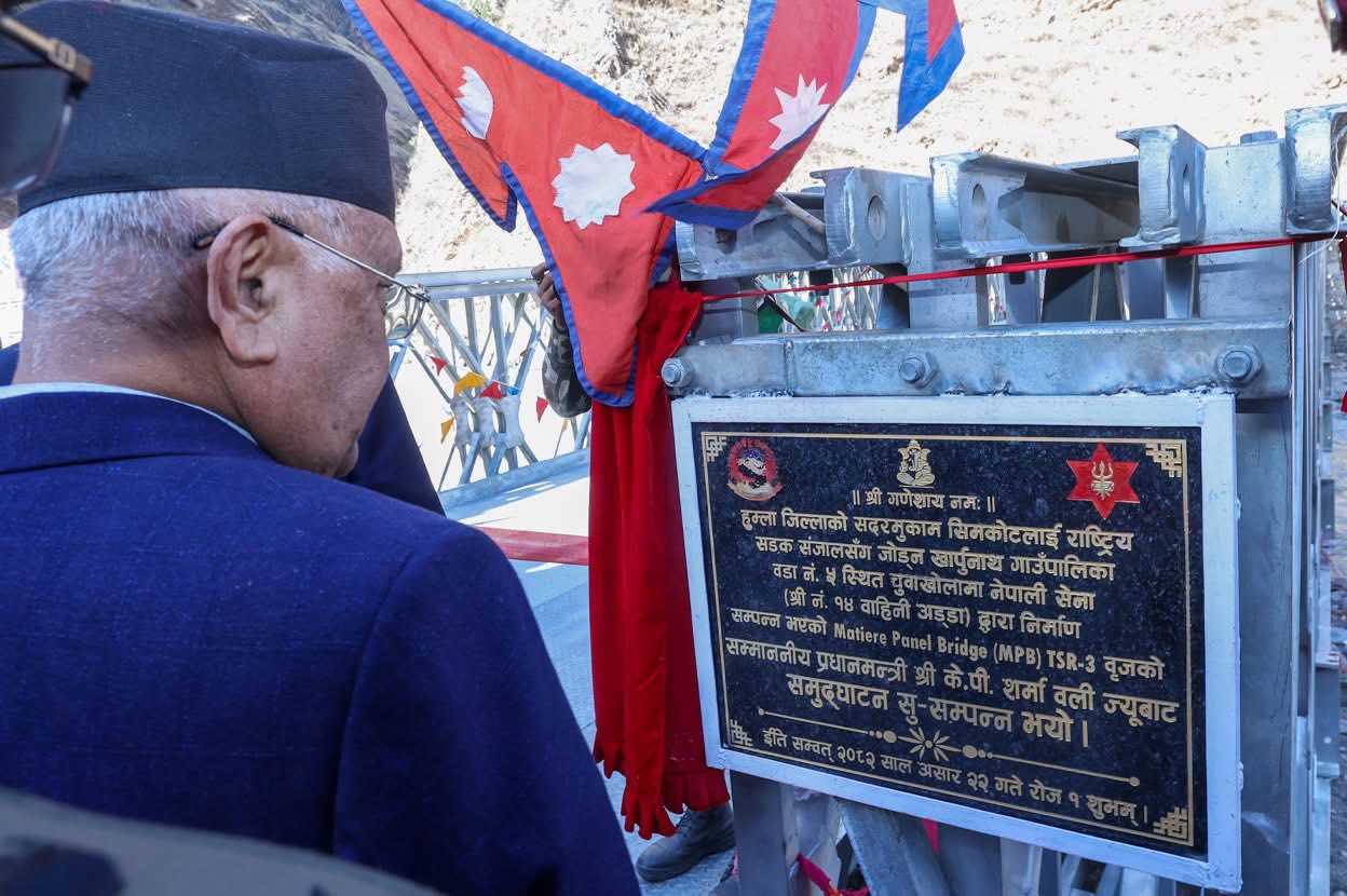 हुम्लालाई सडक सञ्जालसँग जोड्न नेपाली सेनाले गत वर्ष चैत १० गतेदेखि चुवाखोलामा बेलिब्रिज जडान गर्न सुरु गरेको थियो । उक्त बेलिब्रिजको उद्घाटन गर्न प्रधानमन्त्री ओली नेपाली सेनाको हेलिकप्टरमा आज काठमाडौँबाट सुर्खेत हुँदै खार्पुनाथ पुगेका हुन् ।