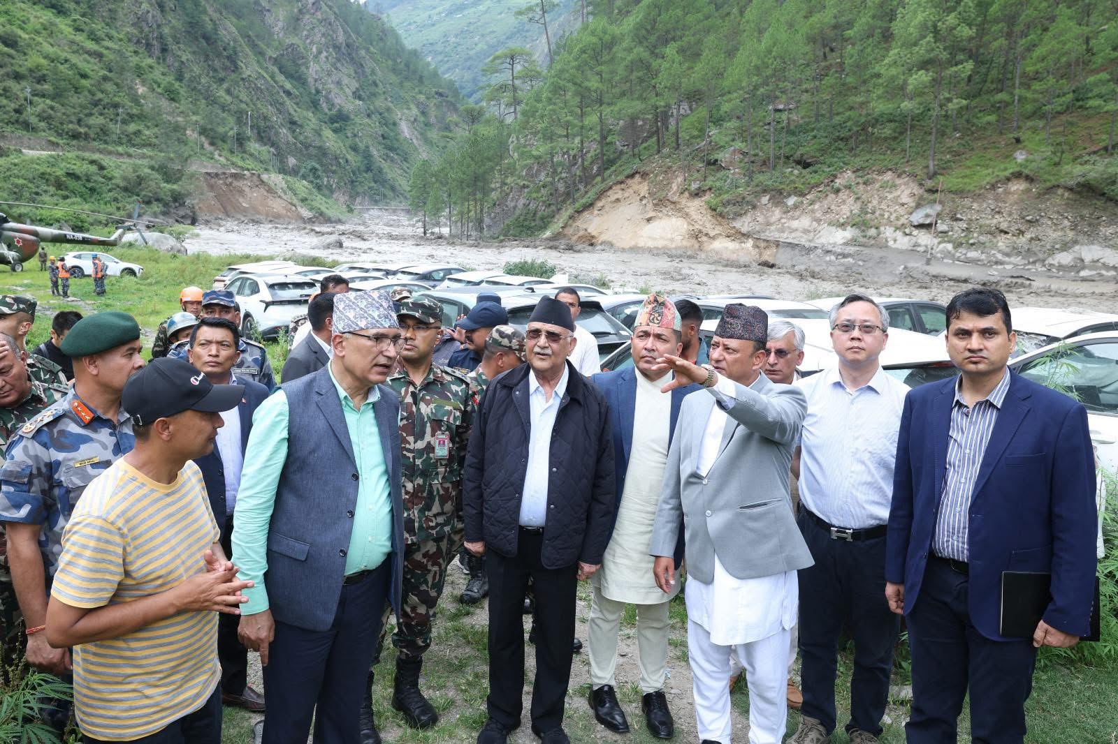 प्रधानमन्त्री ओलीसँगै उपप्रधानमन्त्री एवं अर्थमन्त्री विष्णु पौडेल, गृहमन्त्री रमेश लेखक, ऊर्जामन्त्री दीपक खड्का पनि बाढी प्रभावित क्षेत्रको अवलोकन गर्न पुगेका थिए ।