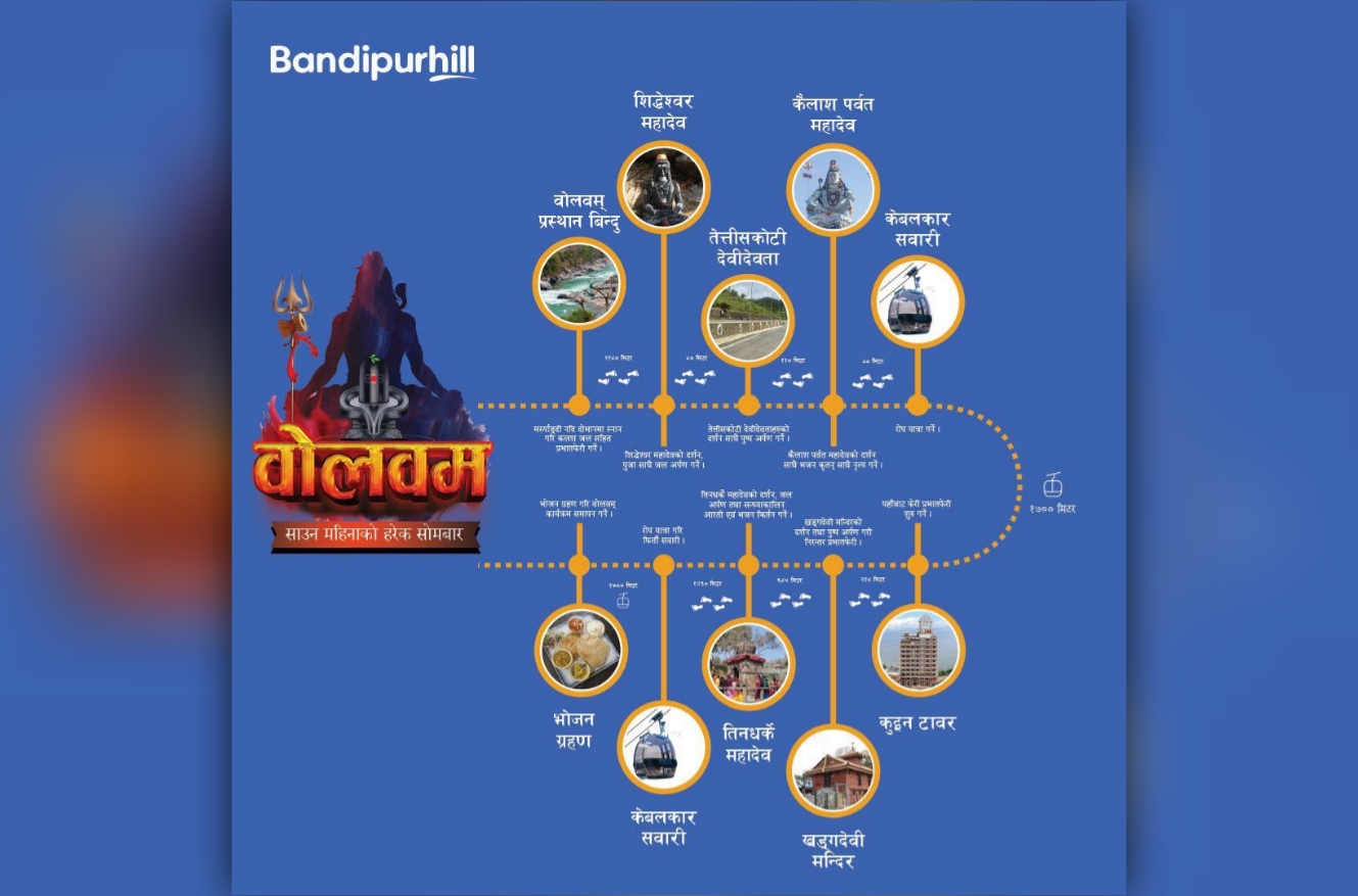 शिव महिम्नाहा उत्सव अन्तर्गतको बोलबम जात्राको प्रवर्धन आदियोगी प्रज्ञा धाम, बन्दीपुर केवलकार एण्ड टुरिजम लिमिटेडको सहकार्यमा गरिएको हो। तीर्थालुहरूका लागि धार्मिक यात्रामा सहयोग पुर्याउन केवलकारको टिकट मूल्य मात्र २०० रुपैयाँ तोकिएको छ। वृद्ध तीर्थालुहरूका लागि भने टिकट निःशुल्क गरिएको बन्दीपुर केवलकार एण्ड टुरिजम लिमिटेडका प्रमुख कार्यकारी अधिकृत रोमनमान श्रेष्ठले जानकारी दिए।