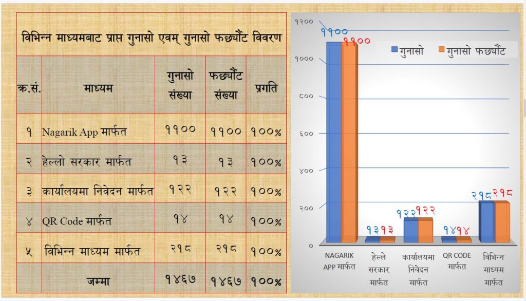 नागरिक एपमार्फत् एक हजार एक सय, हेल्लो सरकारमार्फत् १३, कार्यालयमा निवेदनमार्फत् एक सय २२, क्युआर कोडमार्फत् १४ र विभिन्न माध्यममार्फत् दुई सय १८ गुनासो प्राप्त भएका थिए । सबै गुनासोको सुनुवाइ गरी फछ्र्योट गरिएको प्रजिअ अधिकारीले बताए ।