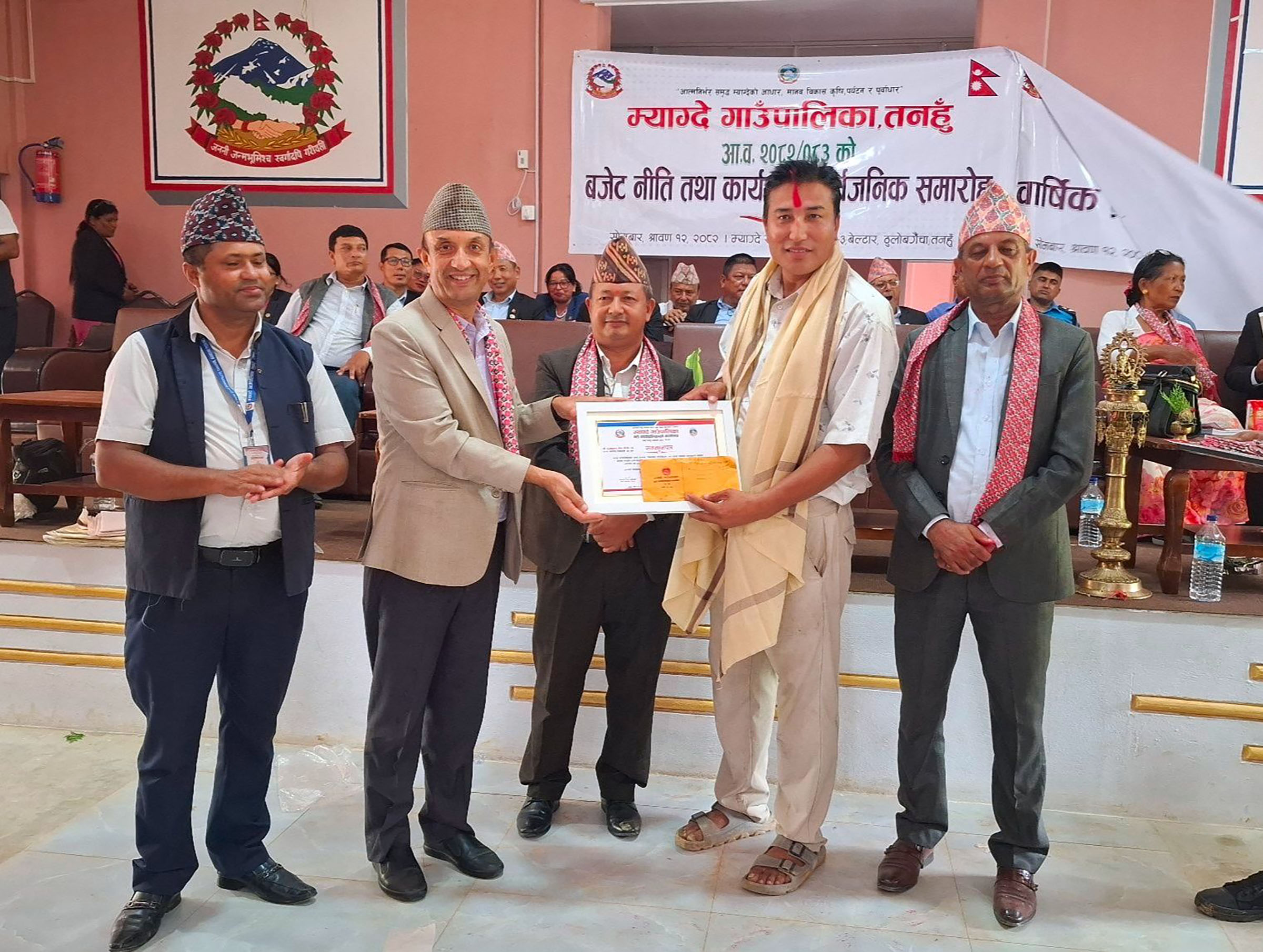 गाउँपालिकाले आयाेजना गरेकाे बजेट, नीति तथा कार्यक्रम सार्वजनिक समाराेहमा श्रेष्ठलाई जिल्ला समन्वय समितिका प्रमुख शान्तिरमण वाग्ले, म्याग्दे गाउँपालिकाका अध्यक्ष श्रीप्रसाद श्रेष्ठले उनलाई पुरस्कृत गरेका हुन् ।