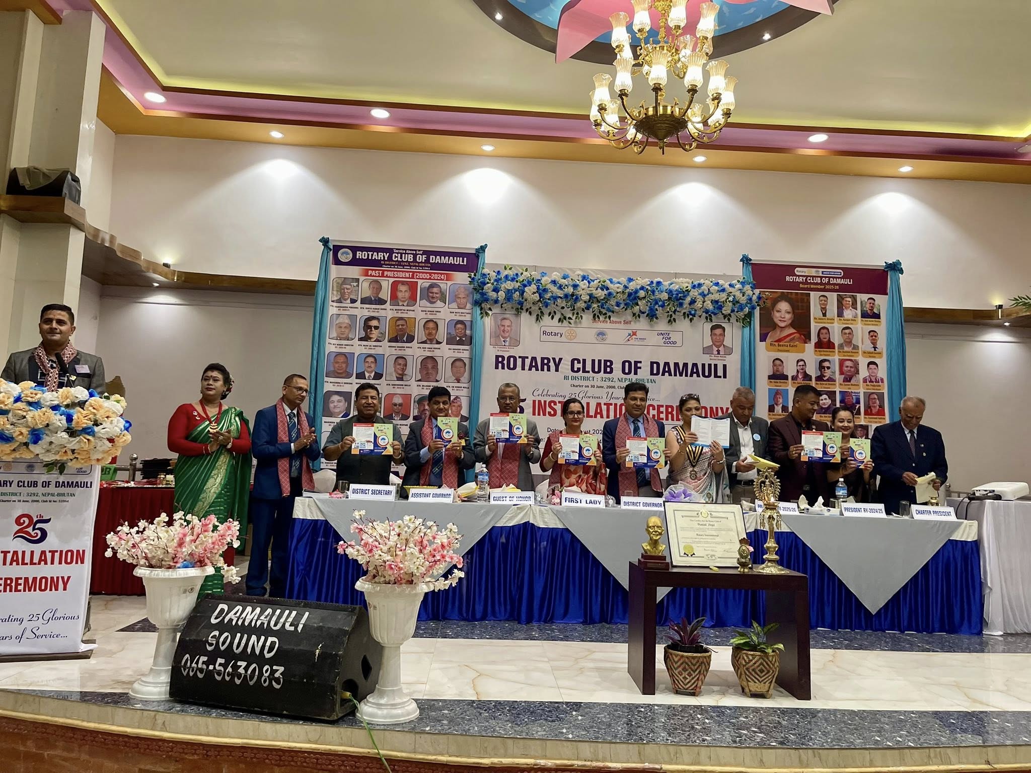 दमाैली, २२ साउन । रोटरी क्लब अफ दमौलीको २५औं पदस्थापना कार्यक्रम बुधबार दमौलीमा सम्पन्न भएको छ। पदस्थापनासँगै रोटरी क्लब अफ दमौलीकी वर्ष २०२५/२६ की अध्यक्ष विणा कैनीले पदभार ग्रहण गरेकी छिन्। वर्ष २०२४/२५ का अध्यक्ष जीवनकुमार श्रेष्ठले आफ्नो कार्यकाल सफलतापूर्वक सम्पन्न गरी सम्पूर्ण जिम्मेवारी वर्ष २०२५/२६ की अध्यक्ष कैनीलाई हस्तान्तरण गरेका हुन्।