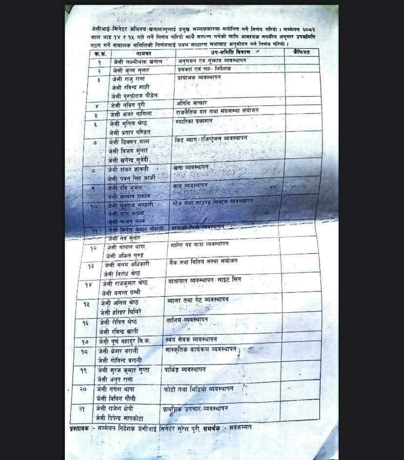 सम्मेलनका लागि अनुगमन एवं सुझाव व्यवस्थापन, अतिथि सत्कार, स्मारिका प्रकाशन, खाना व्यवस्थापन, बास व्यवस्थापन, शान्ति पदयात्रा व्यवस्थापन लगायतका उपसमिति गठन गरिएको छ ।