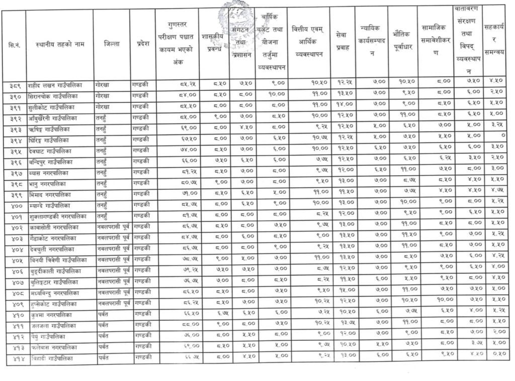मन्त्रालयले शुक्रबार सार्वजनिक गरेको नतिजा अनुसाप म्याग्दे जिल्ला प्रथम भएको हो । म्याग्दे गाउँपालिकाले ८५.७५ अंक प्राप्त गरेको छ ।