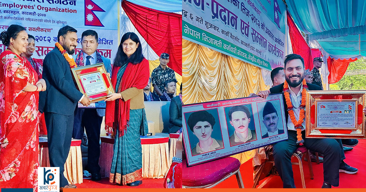 यसै अवसरमा नेपाल निजामती कर्मचारी संगठन केन्द्रीय कार्य समितिको आयोजनामा शुक्रबार सम्पन्न नेपाली महिलाहरुको महान पर्व हरितालिका तिज-२०८२ को शुभकामना आदान–प्रदान तथा सम्मान कार्यक्रममा तनहुँ जिल्ला कार्य समितिका अध्यक्ष भगवान त्रिपाठीलाई उत्कृष्ट कार्य समितिको सम्मानपत्र संघीय मामिला तथा सामान्य प्रशासनमन्त्री भगवती न्याैपानले हस्तान्तरण गरेकी छन् ।
