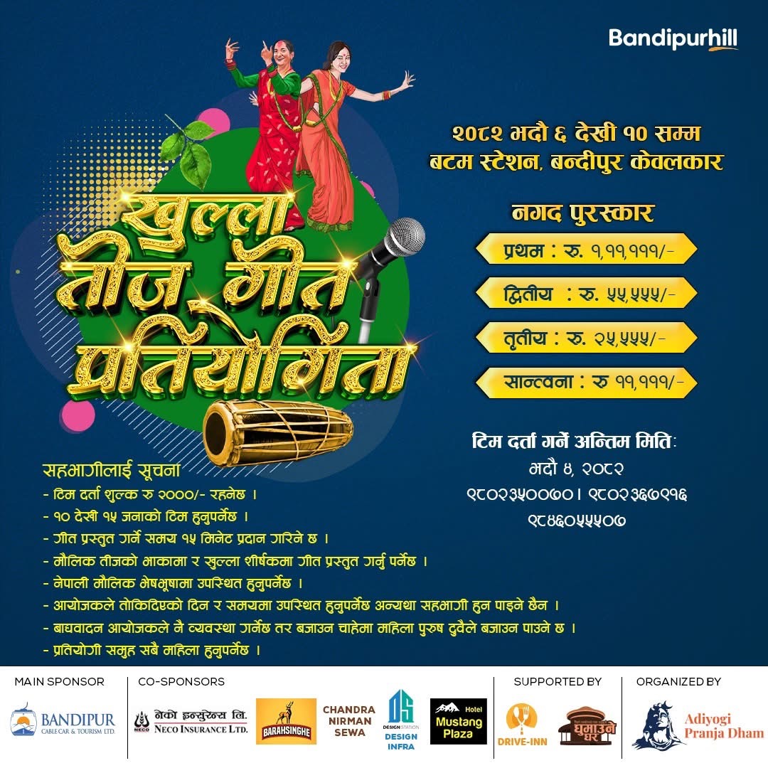 दमौली, ७ भदौ । आदियोगी प्रज्ञा धामको आयोजनामा बन्दीपुर केवलकारको बटम स्टेशनमा तीज सप्ताहान्न उत्सव सुरु भएको छ ।