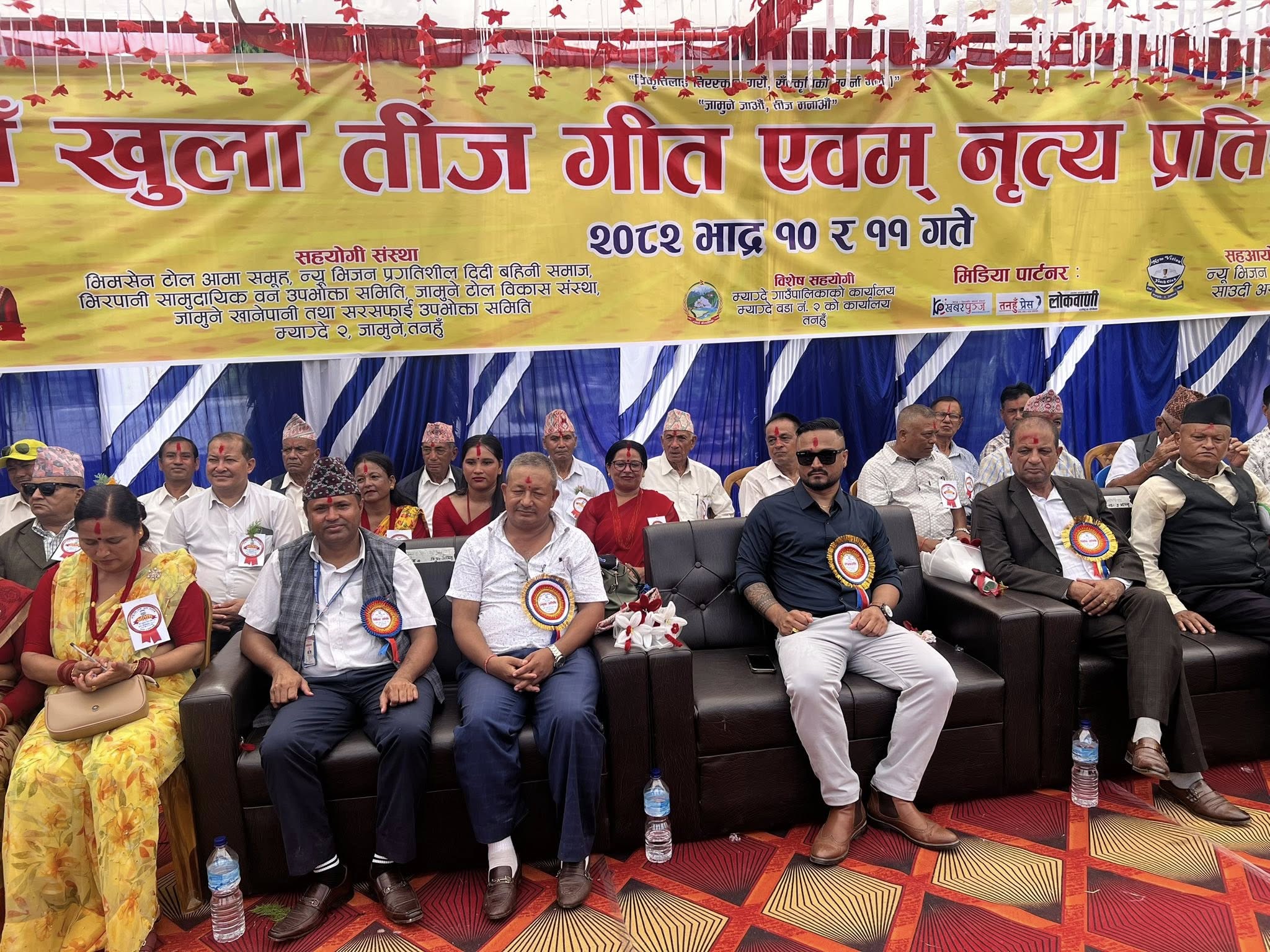 दमौली, १० भदौ । म्याग्दे गाउँपालिका-२ जामुनेस्थित न्यु भिजन युथ क्लवको आयोजनामा मंगलबारदेखि जामुने बजारमा खुल्ला तीज गीत प्रतियोगिता सुरु भएको छ । न्यु भिजन साउदी परिवारको सह–आयोजना तथा म्याग्दे गाउँपालिका कार्यालय, वडा नम्बर २ कार्यालयको विशेष सहयोगमा आयोजित उक्त प्रतियोगिताको म्याग्दे गाउँपालिकाका अध्यक्ष श्रीप्रसाद श्रेष्ठले उदघाटन गरेका छन् ।