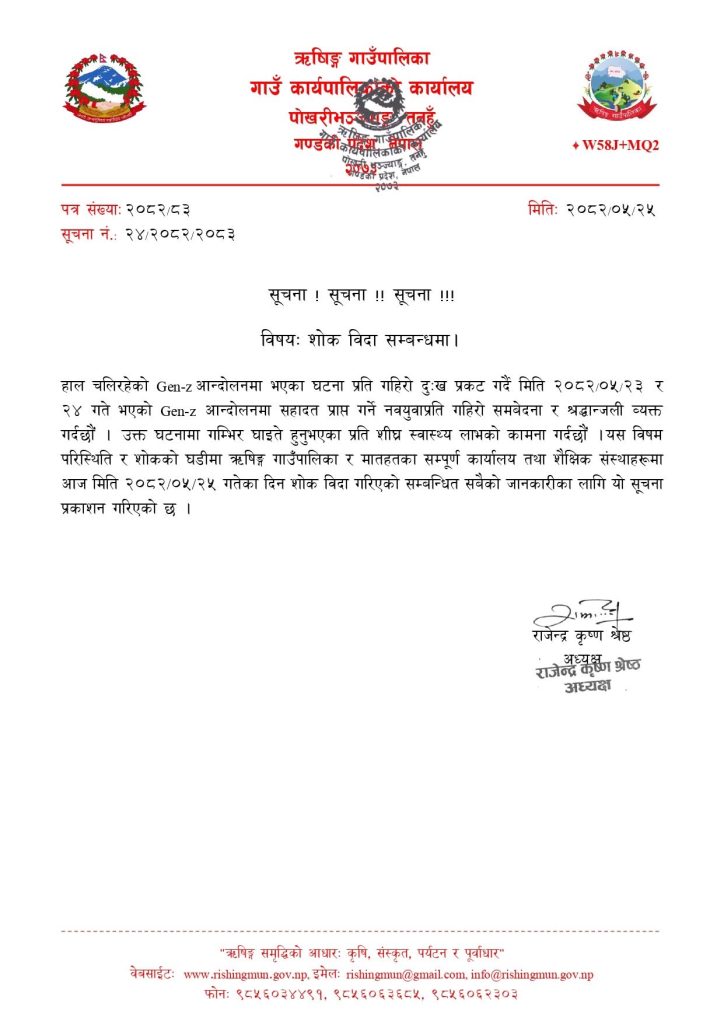 दमौली, २५ भदौ । भदौ २३ र २४ गते भएको आन्दोलन र त्यसबाट उत्पन्न परिस्थितिका कारण तनहुँका विभिन्न स्थानीय तहले आज बिदा दिने निर्णय गरेका छन् ।