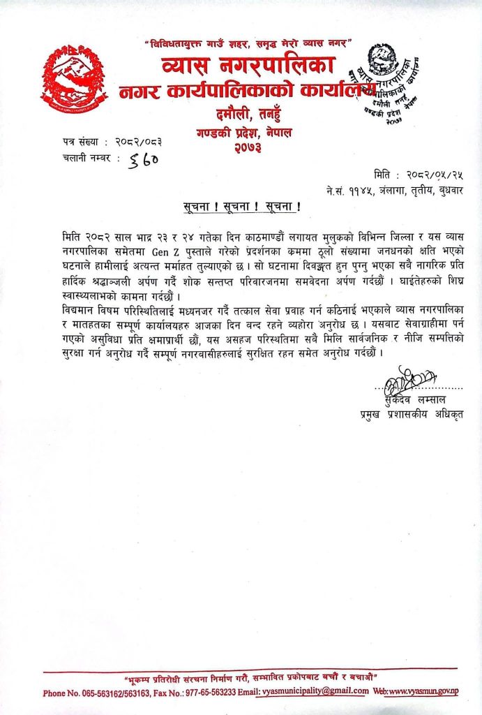 व्यास नगरपालिकाका प्रमुख प्रशासकीय अधिकृत सुकदेव लम्सालले विद्यमान विषम परिस्थितिलाई मध्यनजर गर्दै तत्काल सेवा प्रवाह गर्न कठिनाई भएकाले व्यास नगरपालिका र मातहतका सम्पूर्ण कार्यालयहरु आजका दिन बन्द रहने जनाएका छन् ।