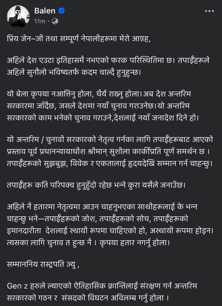 जेनजी प्रतिनिधिहरूले कार्कीलाई नयाँ नेतृत्वका लागि प्रधानसेनापति अशोक सिग्देलसमक्ष प्रस्ताव गरेका थिए । उक्त प्रस्तावमा मेयर बालेनले पनि समर्थन जनाएका हुन् ।
