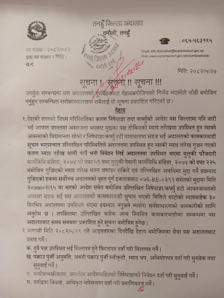 देशको हालको विषम परिस्थितिका कारण निषेधाज्ञा तथा कफ्र्युको आदेश तनहुँ जिल्लामा पनि जारी भएकाले आवतजावतमा असहजता भएबाट मुद्धाका पक्ष तोकिएको म्याद तारेखमा उपस्थित हुन नसक्ने विद्यामानता रहेको र निषेधाज्ञा कफ्र्यु हटी यातायातमा सहज भइ अदालतको कामकारवाही सुचारु भएपश्चात् उल्लेखित परिस्थितिले अदालतमा उपस्थित हुन नसकी म्याद तारेख गुज्रन गएको कारण म्याद तारेक थामी पाउँ भनी निवेदन लिई अदालतमा उपस्थित भएमा मुलुकी फौजदारी कार्यविधि संसहता, २०७४ को दफा ५९ तथा मुलुकी देवानी कार्यविधि संहिता, २०७४ को दफा २२५ बमोजिम गुज्रिएको म्याद तारेख थाम्न सकिने जनाइएको छ ।