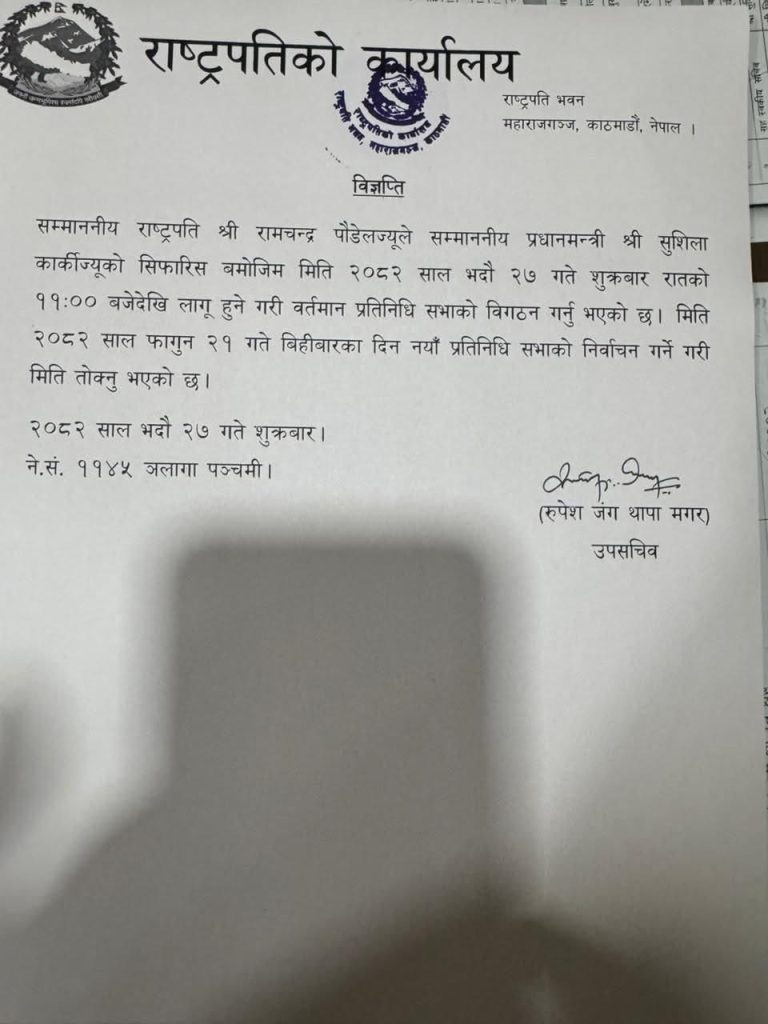 काठमाडौँ, २७ भदौ । राष्ट्रपति रामचन्द्र पौडेलले प्रतिनिधिसभा विघटन गर्ने निर्णय गरेका छन् । नवनियुक्त प्रधानमन्त्री सुशीला कार्कीको सिफारिसका आधारमा राष्ट्रपति  पौडेलले प्रतिनिधिसभा विघटन गर्ने निर्णय गरेका हुन् ।