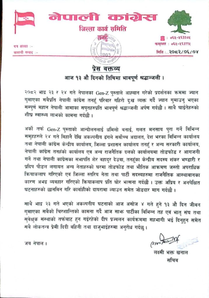 जेनजी पुस्ताको आन्दोलनलाई धमिलो बनाई, गलत मनसाय पुरा गर्ने विभिन्न समुहहरुले २४ गते बिहानैदेखि अकल्पनीय ढंगले सर्वोच्च अदालत, देशभरका विभिन्न कार्यालय तथा नेपाली काँग्रेस केन्द्रीय कार्यालय, जिल्ला प्रशासन कार्यालय तनहुँ र अन्य सरकारी कार्यालय, नेपाली कांग्रेस तनहुँको कार्यालय एव अन्य राजनैतिक दलको कार्यालयमा तोडफोड र आगजनी गर्ने तथा नेपाली कांग्रेसका सभापति शेर वहादुर देउवा, तनहुँका केन्द्रीय सदस्य शंकर भण्डारी र प्रदिप पौडल लगायत अन्य नेताहरुको घरमा तोडफोड तथा भौतिक आक्रमण जस्तो अपराधिक क्रियाकलाप गरिएको एवं जिल्ला स्तरीय नेता तथा पार्टी सदस्यहरुमा राजनैतिक आस्थावानका कारण अभद्र व्यवहार गरिएको क्रियाकलाप प्रति पार्टीले घोर भत्सना गरेको छ।
