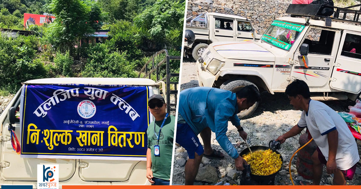दमाैली, ९ असाेज । तनहुँको आँबुखैरेनी-४, संगम टोलस्थित पुल जिप युवा क्लबले तुइन खोलामा गएको पहिरोका कारण अलपत्र परेका यात्रुहरूलाई निःशुल्क खानाको व्यवस्था गरेको छ।नारायणगढ–मुग्लिन सडक खण्डअन्तर्गत तुइन खोलामा हालै गएको ठूलो पहिरोले सडक अबरुद्ध भएपछि सयौं यात्रुहरू बाटोमै रोकिएका थिए।