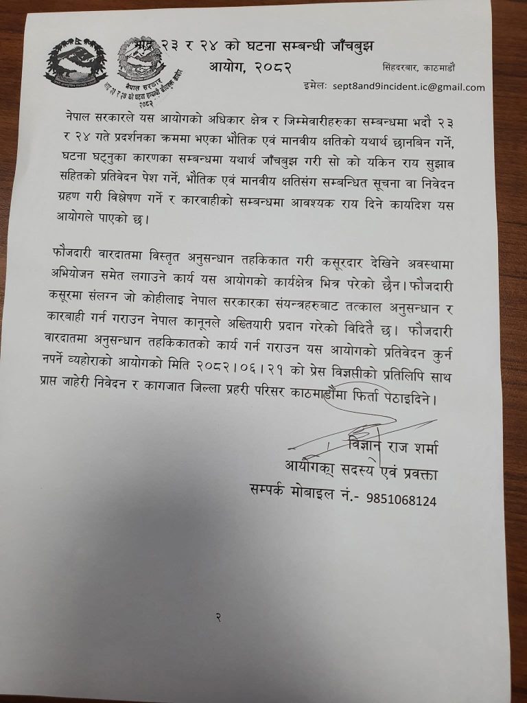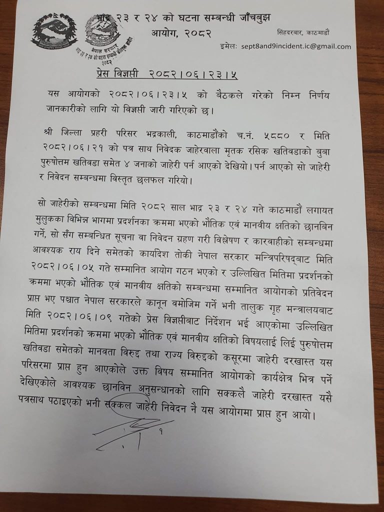जेनजी आन्दोलनबारे छानबिन गर्न बनेको जाँचबुझ आयोगले उनीहरूविरुद्धको जाहेरी प्रहरीमै फिर्ता गरिदिएको हो ।