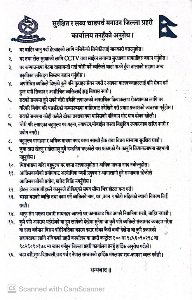 घर बाहिर जानु पर्दा हेरचाहको लागि नजिकैको छिमेकीलाई जानकारी गराउन, घर तथा टोल सुरक्षाका लागि सिसिटिभी तथा साईरन लगायत सुरक्षाका सामाग्रीहरु जडान गर्न आग्रह गरिएको छ ।