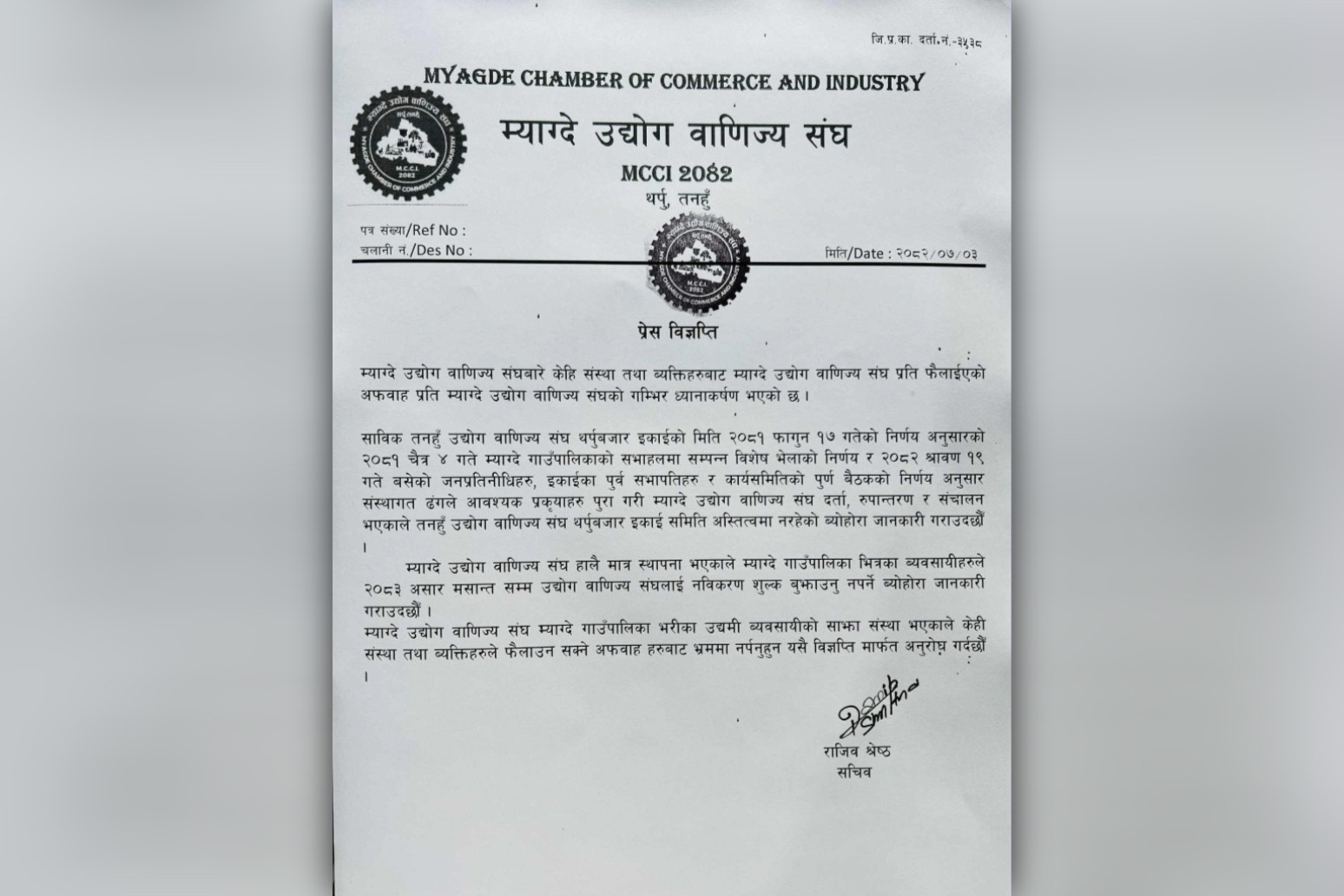 संघका सचिव राजिव श्रेष्ठले सोमबार विज्ञप्ती जारी गरी म्याग्दे उद्योग वाणिज्य संघबारे केहि संस्था तथा व्यक्तिहरुबाट फैलाईएको अफवाह प्रति ध्यानाकर्षण भएको उल्लेख गरेका छन् ।