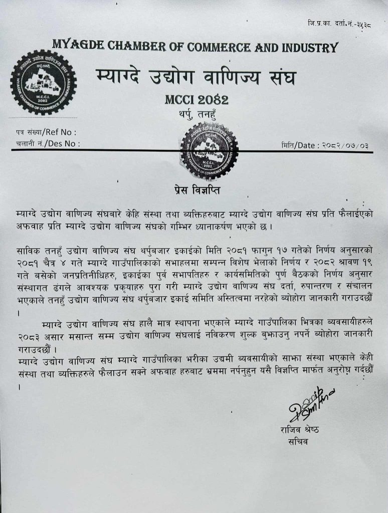 विज्ञप्तीमा भनिएको छ, ‘साविक तनहुँ उद्योग वाणिज्य संघ थर्पुबजार इकाईको मिति २०८१ फागुन १७ गतेको निर्णय अनुसारको २०८१ चैत्र ४ गते म्याग्दे गाउँपालिकाको सभाहलमा सम्पन्न विशेष भेलाको निर्णय र २०८२ श्रावण १९ गते बसेको जनप्रतिनीधिहरु, इकाईका पूर्व सभापतिहरु र कार्यसमितिको पूर्ण बैठकको निर्णय अनुसार संस्थागत ढंगले आवश्यक प्रकृयाहरु पुरा गरी म्याग्दे उद्योग वाणिज्य संघ दर्ता, रुपान्तरण र संचालन भएकाले तनहुँ उद्योग वाणिज्य संघ थर्पुबजार इकाई समिति अस्तित्वमा नरहेको ब्योहोरा जानकारी गराउदछौँ ।’