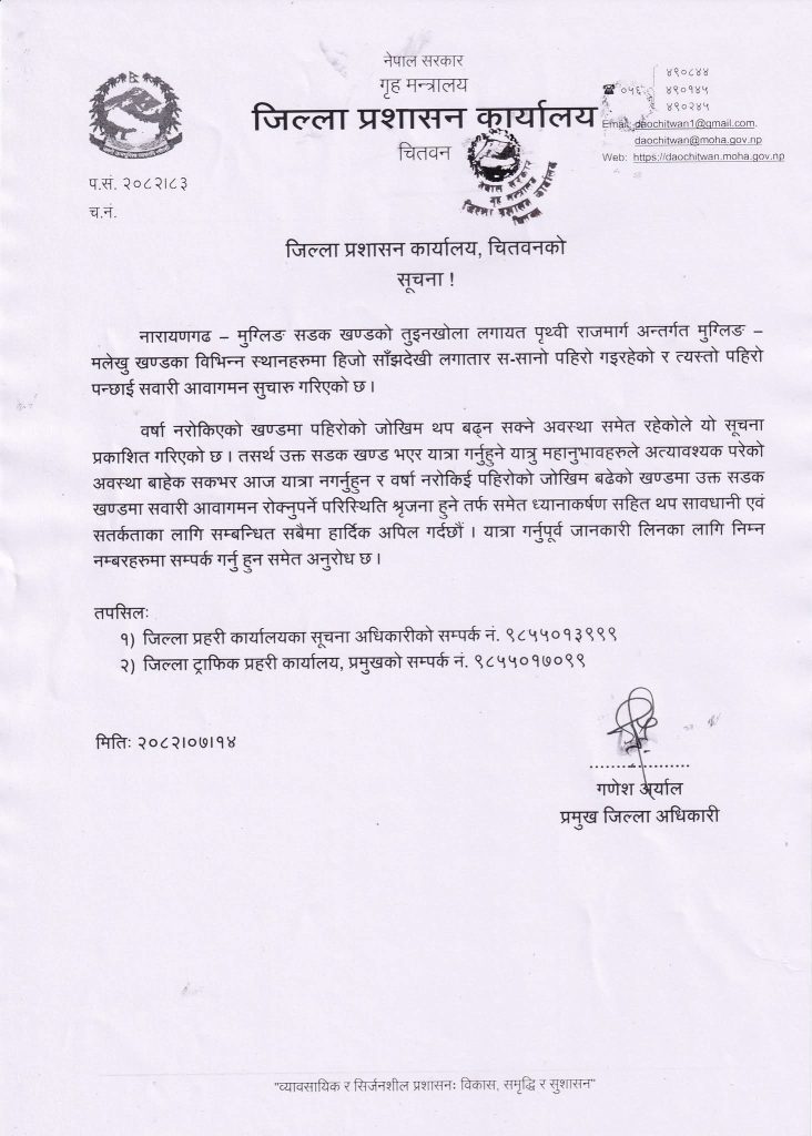 प्रमुख जिल्ला अधिकारी गणेश अर्यालद्वारा जारी सूचनामा नारायणगढ-मुग्लिन सडकको तुइनखोला र पृथ्वी राजमार्गको मुग्लिनदेखि मलेखुसम्म हिजो साँझदेखि नै स-साना पहिरो खसिरहेको उल्लेख छ ।वर्षा नरोकिएकाले पहिरोको जोखिम बढेको प्रशासनको भनाइ छ ।