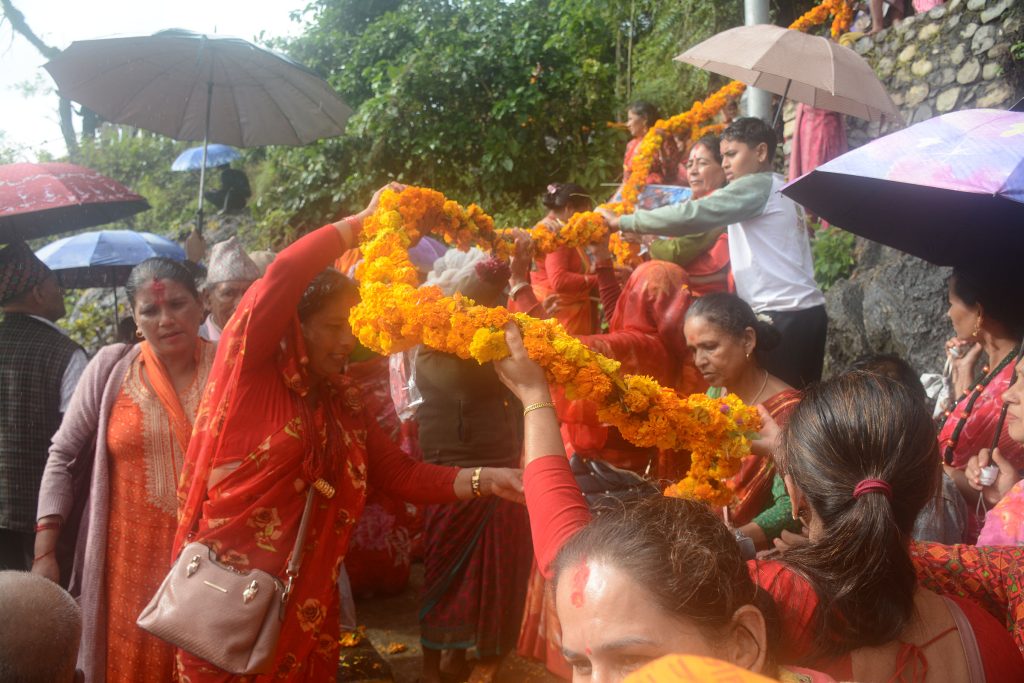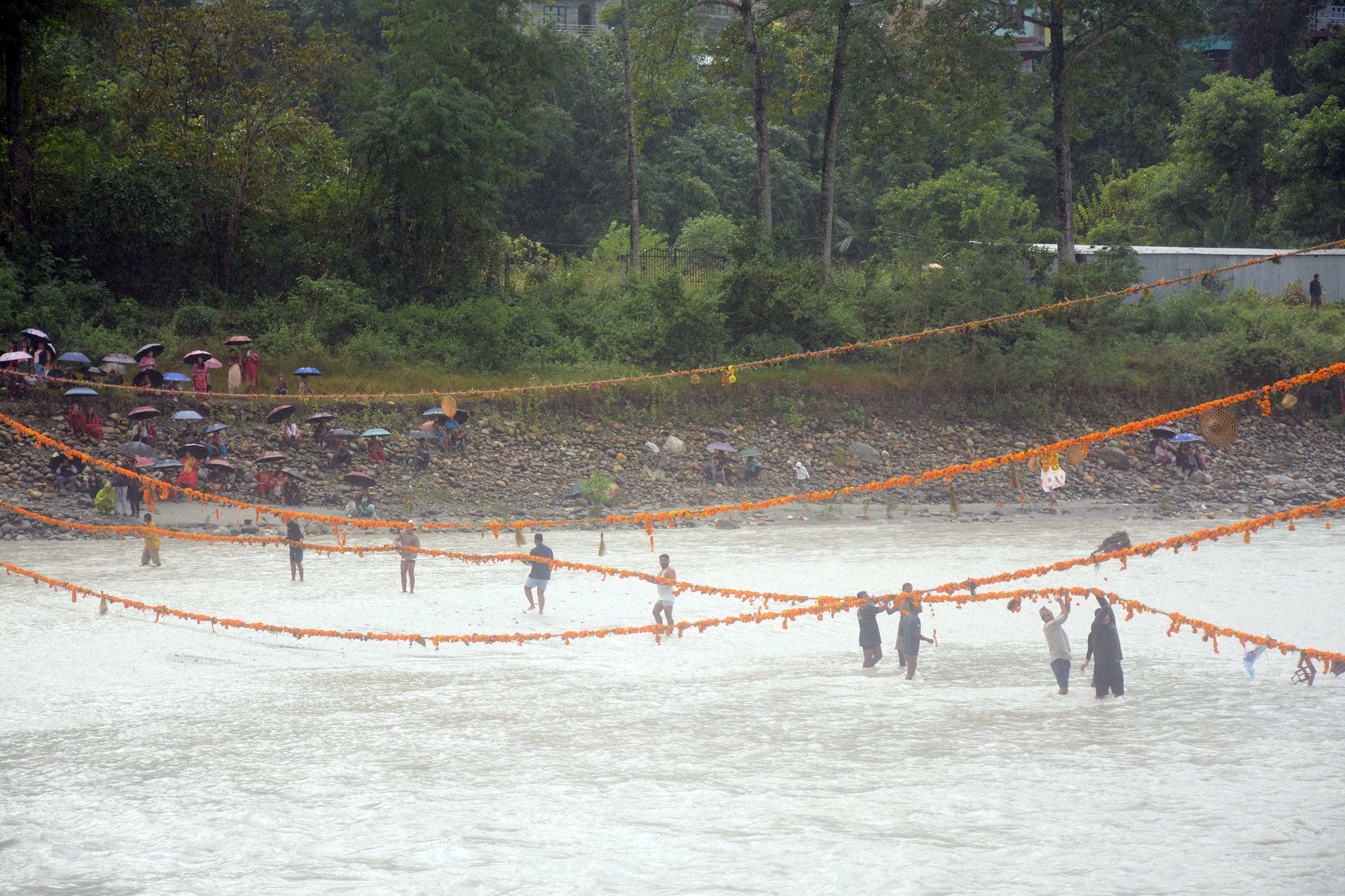 व्यास नगरपालिकाका विभिन्न ठाउँमा ल्याइएको फूलको तोरण नदीमा तारिएको हो । व्यास नगरपालिका–३ दमौलीका तारानाथ घिमिरेले फूलको तोरण तार्दा दुवैपट्टि लिङ्गो राखेर तार्ने प्रचलन रहँदै आएको जानकारी दिए ।