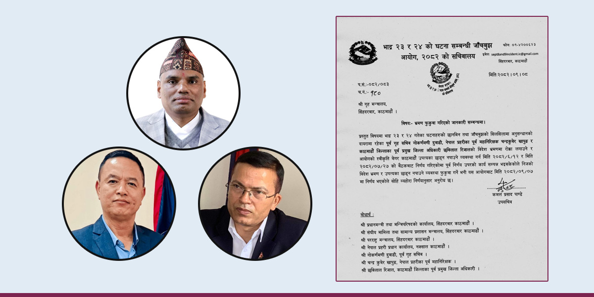काठमाडौ, ८ पुस । भदौ २३-२४ को घटनासम्बन्धी जाँचबुझ आयोगले तीन जनाको स्थानहद फुकुवा गरेको छ। अनुसन्धानको दायरामा रहेका पूर्व गृहसचिव पूर्वगृहसचिव गोकर्णमणि दुवाडी, पूर्वआईजीपी चन्द्रकुबेर खापुङ र काठमाडौँका पूर्वप्रमुख जिल्ला अधिकारी छविलाल रिजालको स्थानहद फुकुवा गरिएको आयोगले जनाएको छ।