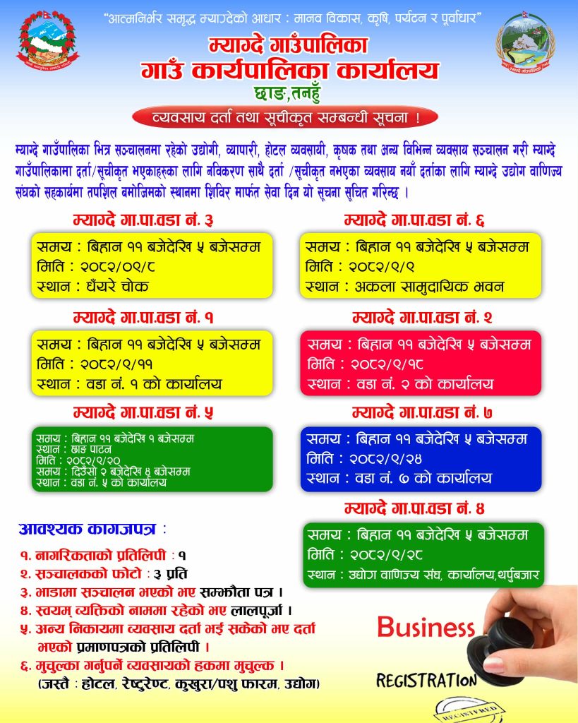 दमौली, ८ पुस । म्याग्दे गाउँपालिकामा व्यवसाय दर्ता तथा नविकरण शिविर मंगलबारदेखि सुरु भएको छ । म्याग्दे उद्योग वाणिज्य संघको सहकार्यमा म्याग्दे-३ धँयरेबाट शिविर सुरु भएको छ ।