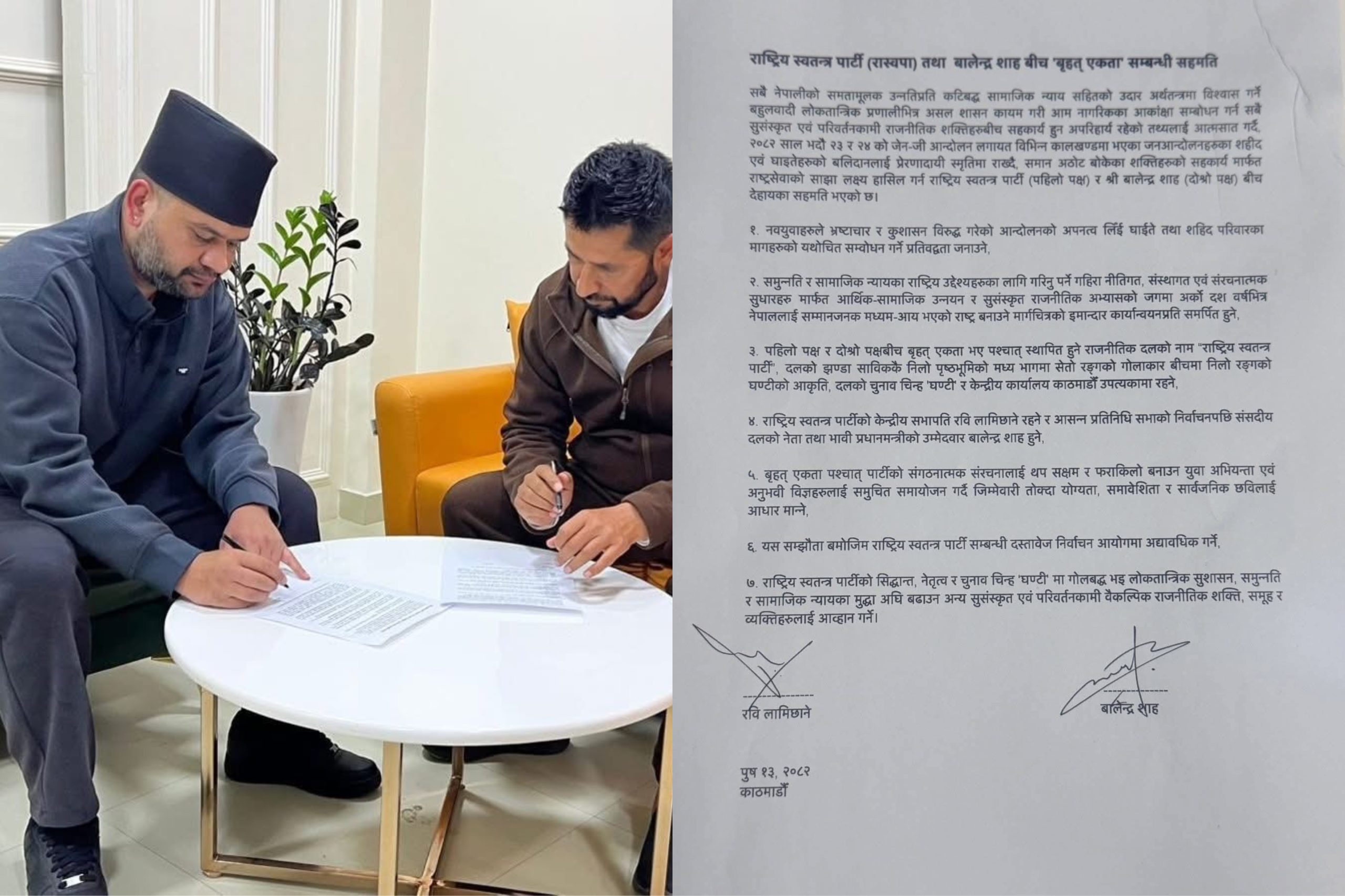 काठमाडौ, १३ पुस । राष्ट्रिय स्वतन्त्र पार्टीका सभापति रवि लामिछाने र काठमाडौं महानगरपालिका मेयर बालेन शाहबीच सहमतिमा हस्ताक्षर भएको छ।