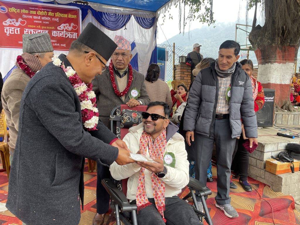 दमौली, १९ पुस । राष्ट्रिय लोक तथा दोहोरी गीत प्रतिष्ठान नेपाल, जिल्ला शाखा तनहुँको आयोजनामा शनिबार व्यास नगरपालिका–३ स्थित प्रशासन चोकमा रक्तदान कार्यक्रम सम्पन्न भएको छ। प्रदेश अस्पताल दमौलीमा पछिल्लो समय देखिएको रगतको अभावलाई मध्यनजर गर्दै सामाजिक उत्तरदायित्वअन्तर्गत उक्त कार्यक्रम आयोजना गरिएको हो।