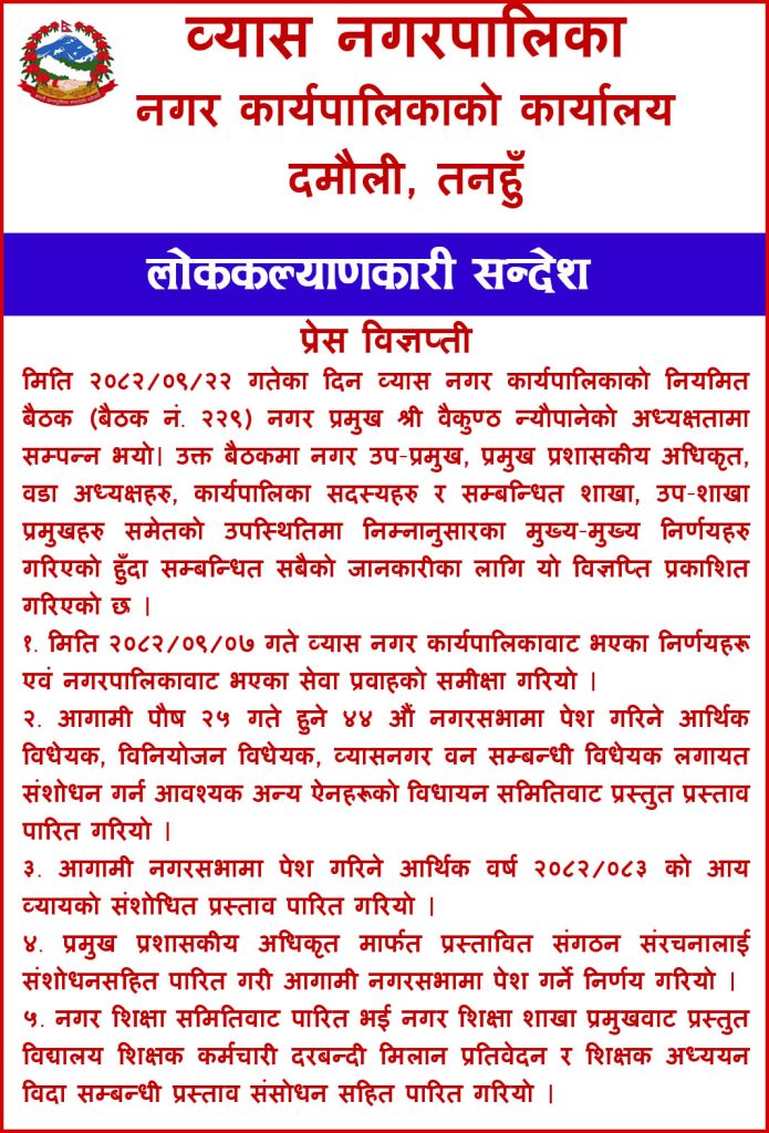 दमौली, २२ पुस । व्यास नगरपालिकाको नगर कार्यपालिकाको नियमित बैठकले विभिन्न महत्वपूर्ण निर्णयहरू गरेको छ। मङ्गलबार सम्पन्न नगर कार्यपालिकाको बैठक (बैठक नं. २२९) का निर्णयहरू सार्वजनिक गरिएको हो। बैठक नगर प्रमुख वैकुण्ठ न्यौपानेको अध्यक्षतामा सम्पन्न भएको थियो।
