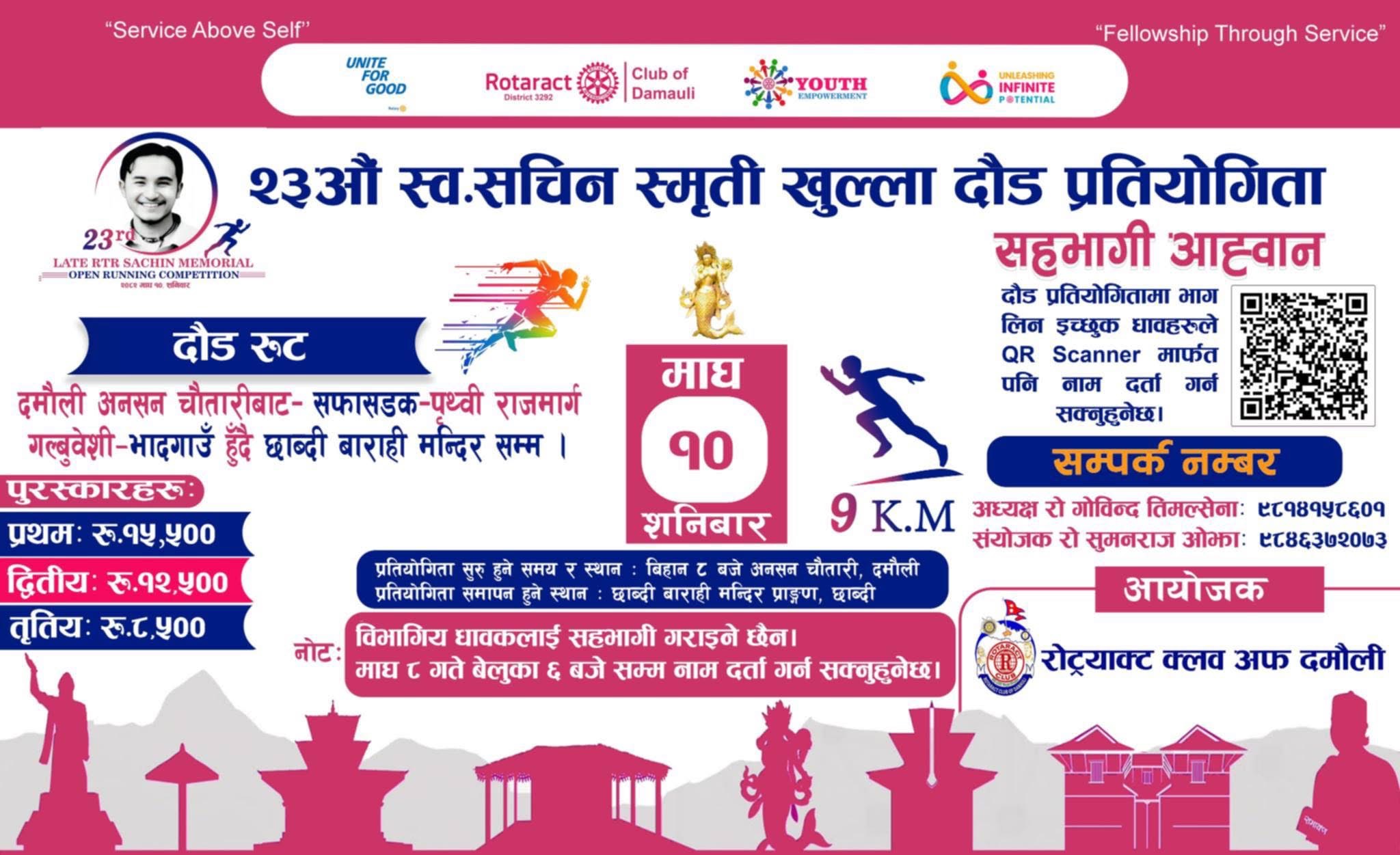 दमौली, ९ माघ । रोटर्याक्ट क्लब अफ दमौलीको आयोजनामा भोलि शनिबार स्व. सचिन स्मृति खुल्ला मिनी म्याराथन कार्यक्रम आयोजना हुने भएको छ। क्लबको सिग्नेचर प्रोजेक्टका रूपमा हरेक वर्ष निरन्तर रूपमा सञ्चालन हुँदै आएको उक्त म्याराथन यस वर्ष पनि आयोजना गर्न लागिएको हो।