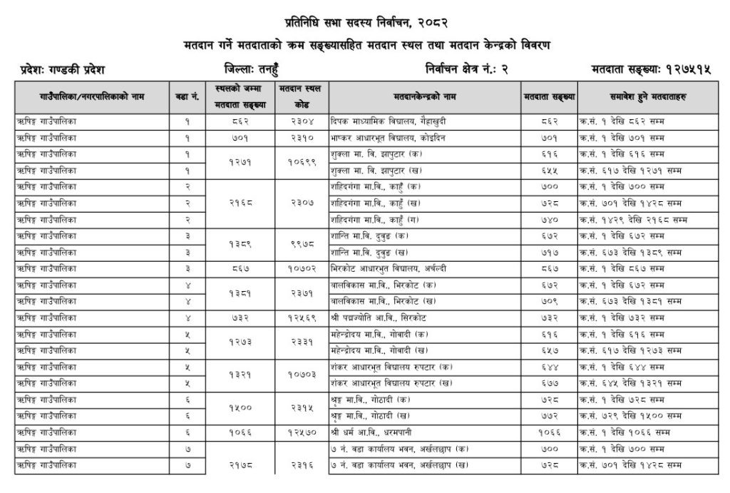 दमौली, १३ माघ ।फागुन २१ गते हुने प्रतिनिधि सभा सदस्य निर्वाचनका लागि तनहुँ-२ मा एक लाख २७ हजार पॉच सय १५ मतदाता छन् । यो क्षेत्रमा म्याग्दे गाउँपालिका, शुक्लागण्डकी नगरपालिका, भिमाद नगरपालिका, ऋषिङ गाउँपालिका, घिरिङ गाउँपालिका र व्यास नगरपालिका-५ र ६ समावेश छ ।