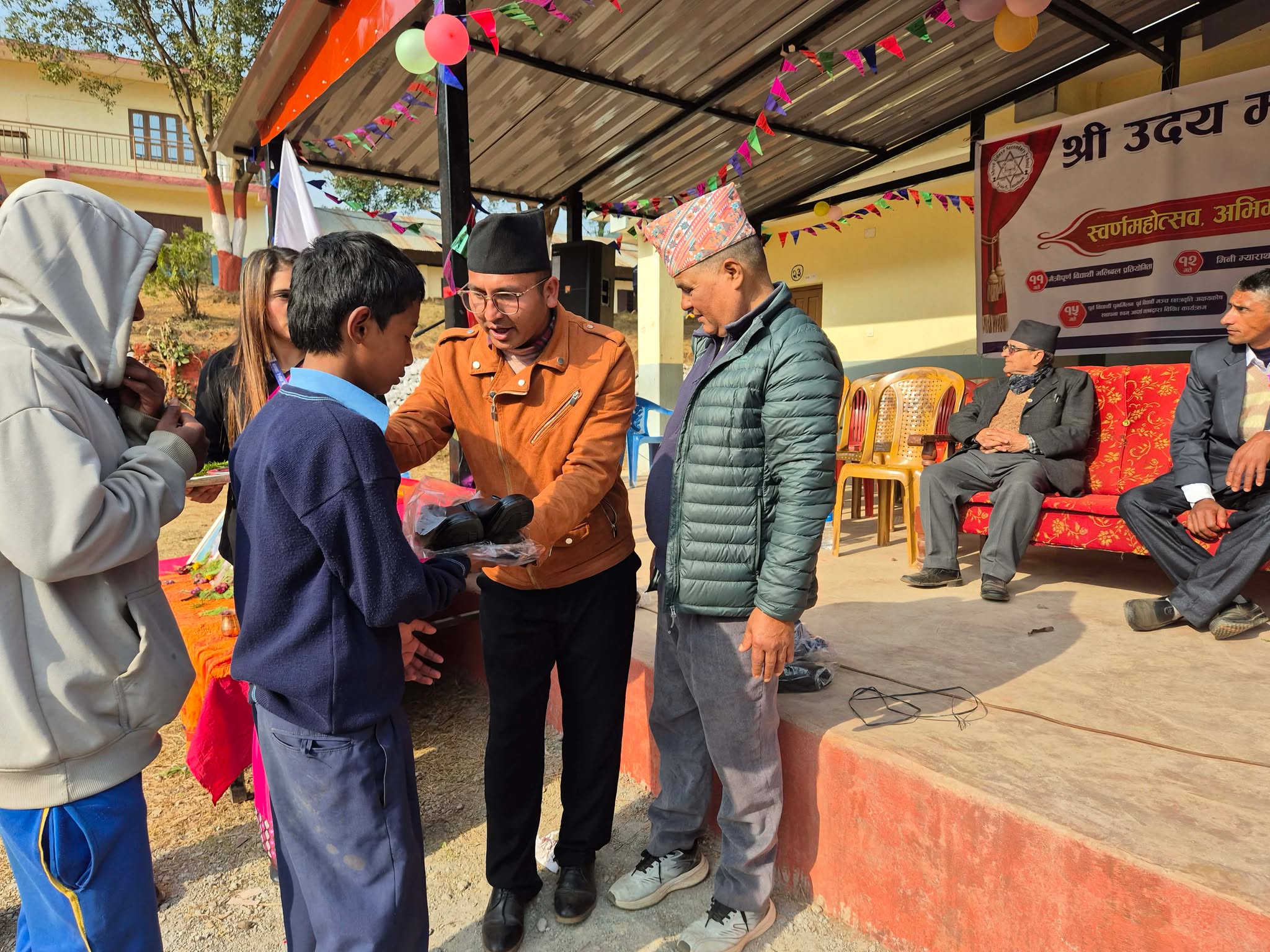 दमाैली, १३ माघ । तनहुँको व्यास नगरपालिका–५ ठुलोटारस्थित उदय माध्यमिक विद्यालयको स्वर्ण वार्षिकोत्सवको अवसरमा विद्यालयमा अध्ययनरत आर्थिक रूपमा कमजोर २० जना विद्यार्थीलाई जुत्ता वितरण गरिएको छ।