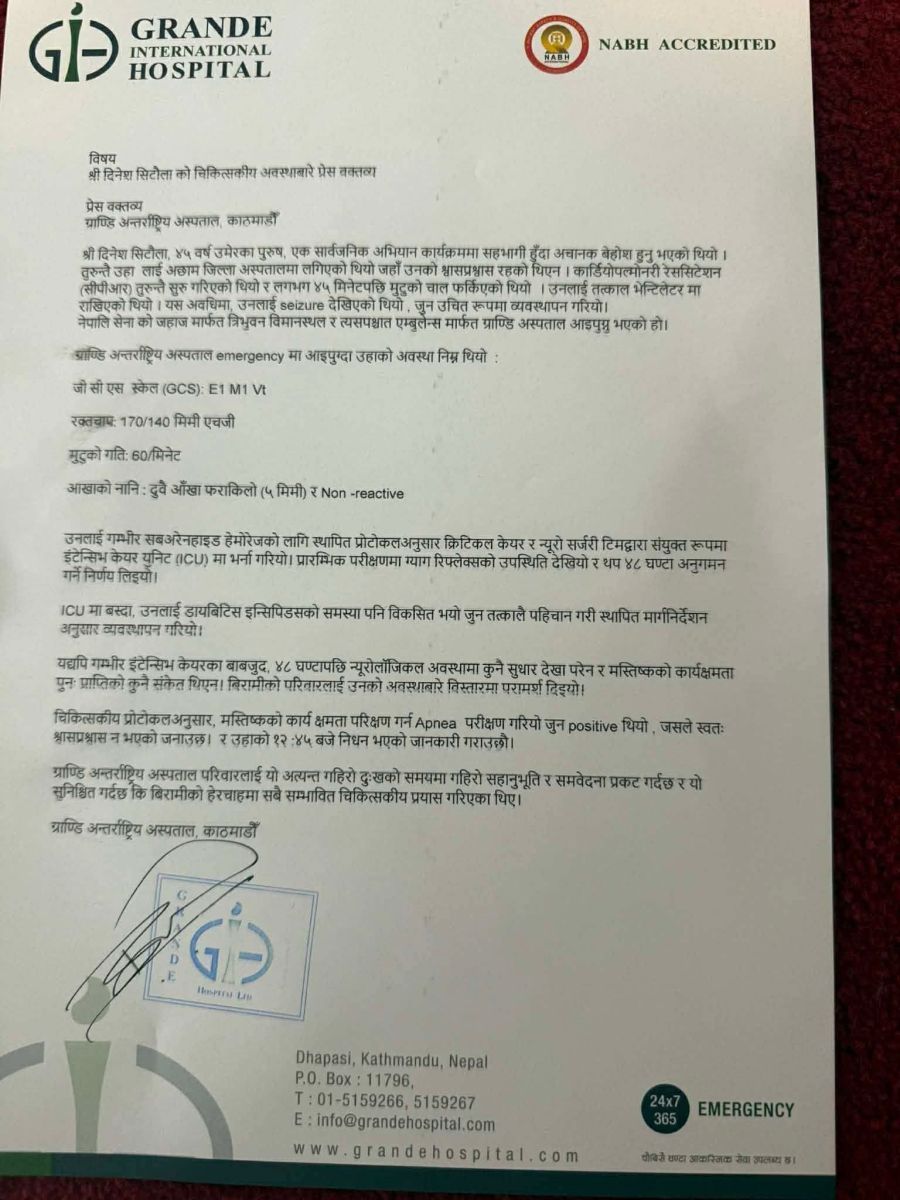 चुनावी अभियानका लागि बालेन्द्रसँगै काठमाडौंबाट सुदूरपश्चिम पुगेका ४४ वर्षीय सिटौला शुक्रबार बिहान अचानक बेहोस भएका थिए। त्यसपछि उनलाई नेपाली सेनाको हेलिकप्टर र स्काई ट्रकमा काठमाडौं ल्याइएको थियो।