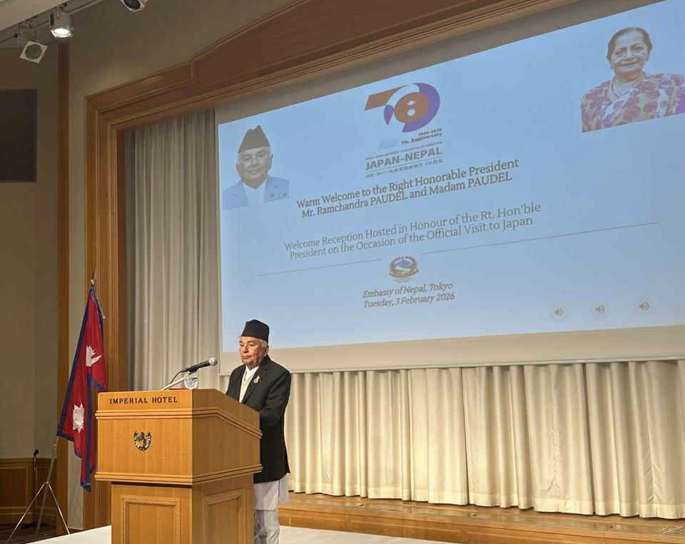 जापान, २० माघ । राष्ट्रपति रामचन्द्र पौडेलले जापानमा बस्ने नेपालीहरूले नेपाली अर्थतन्त्रलगायत नेपालको सामाजिक विकासमा महत्वपूर्ण योगदान पु¥याइरहेको धारणा व्यक्त गरेका छन् । जापानको औपचारिक भ्रमणमा रहनुभएका राष्ट्रपति पौडेलले नेपाली राजदूतावासद्वारा मंगलबार यहाँ आयोजित स्वागत समारोहलाई सम्बोधन गर्दै सो धारणा व्यक्त गरेका हुन् ।
