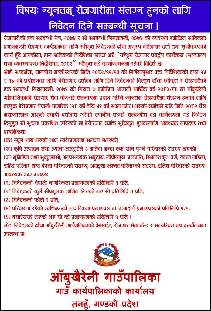 आयोगले निर्धारण गरेका १७ वटा सूचकका आधारमा गरिएको मूल्याङ्कनमा आँबुखैरेनी गाउँपालिका ६७.०७ अङ्क सहित जिल्लामै प्रथम भएको हो ।