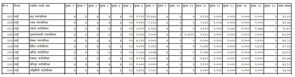 यस्तैगरी भानु नगरपालिकाले ६६.६० अङ्क, व्यास नगरपालिकाले ५८.३५, शुक्लागण्डकी नगरपालिकाले ५४.८०, भिमाद नगरपालिकाले ५८.२४, घिरिङ गाउँपालिकाले ५२.८४, ऋषिङ गाउँपालिकाले ५६.९१, देवघाट गाउँपालिकाले ५८.७७, बन्दीपुर गाउँपालिका ५६.१२ अङ्क प्राप्त गरेको छ ।