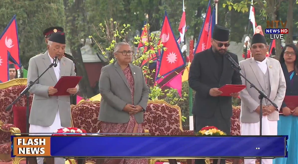 काठमाडौँ, १३ चैत । राष्ट्रपति रामचन्द्र पौडेलसमक्ष नवनियुक्त प्रधानमन्त्री बालेन्द्र शाहले पद तथा गोपनीयताको शपथ लिएका छन् । राष्ट्रपति पौडेलले राष्ट्रपतिको कार्यालयमा आज आयोजित विशेष समारोहमा उनलाई शपथ गराएका हुन् ।