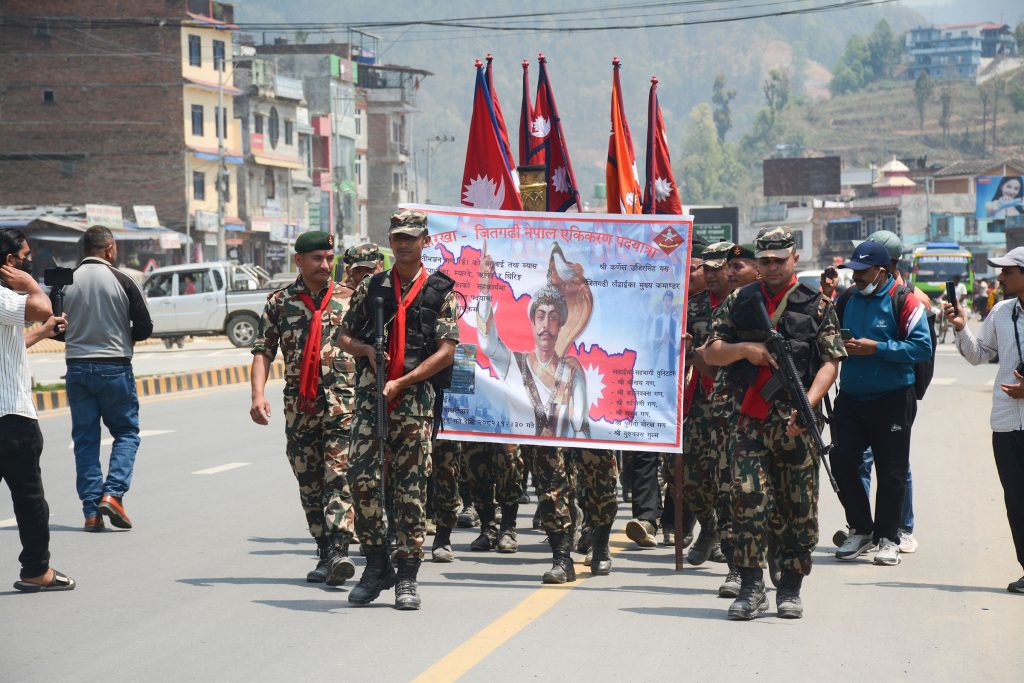 पदयात्रामा बाजागाजा, राष्ट्रिय झण्डा तथा एकीकरणको दौरानमा स्थापना भएका पाँच प्रथम कम्पनी (श्रीनाथ, कालीबक्स, पुरानो गोरख, बर्दवाणी र सबुज) र जितगढी लडाइमा सहभागी गुरुबक्स गुल्मको झण्डा समावेश गरिएको नेपाली सेनाले जनाएको छ । उक्त टोलीमा ३५ जना नेपाली सेनाको सहभागिता रहेको छ ।