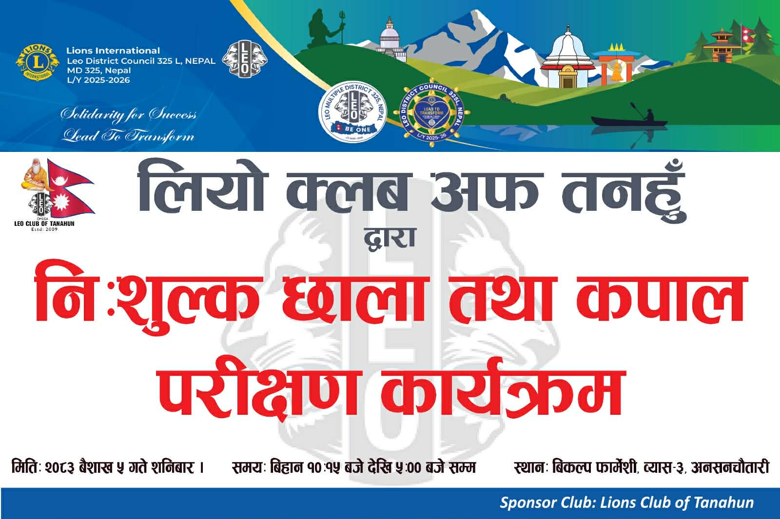 दमाैली, २ वैशाख । सामाजिक सेवामा सक्रिय लियो क्लब अफ तनहुँले एक दिने निःशुल्क अनुहार तथा कपाल परीक्षण कार्यक्रम आयोजना गर्ने भएको छ। उक्त कार्यक्रम यही वैशाख ५ गते, शनिबार, व्यास नगरपालिका–३ स्थित विकल्प फार्मेसीमा सञ्चालन हुने क्लबका अध्यक्ष लियो रोबिन श्रेष्ठले बताए ।