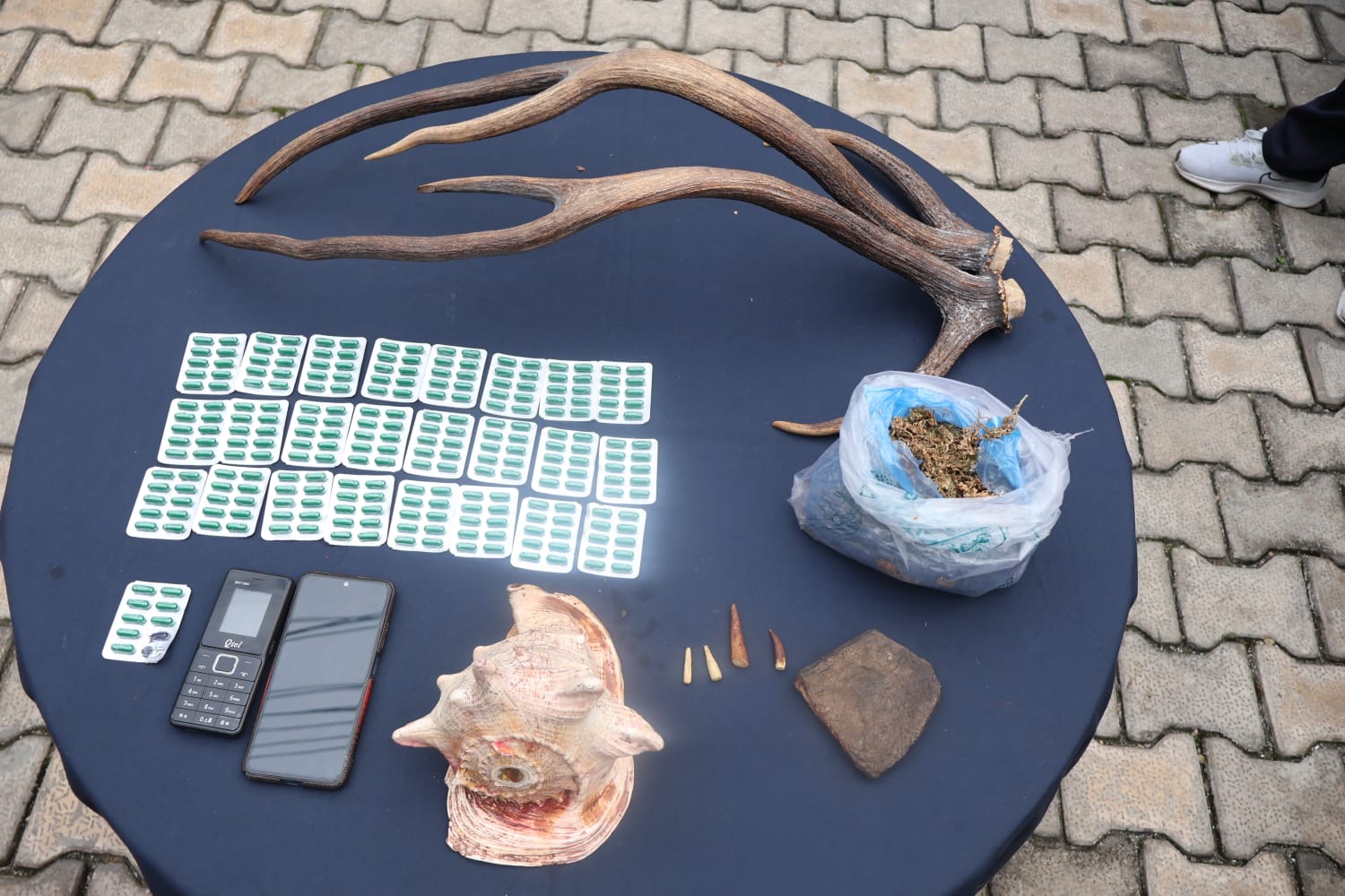 त्यस्तै जरायोको सिङजस्तो देखिने वस्तु दुई थान, गैँडाको छालाजस्तो देखिने सानो टुक्रा एक थान, पञ्चमुखे शङ्ख, खुकुरी, चक्कु, मोबाइल सेटहरू तथा अन्य शङ्कास्पद सामग्रीसमेत बरामद गरिएको विकले बताए ।
