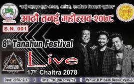 दमौली । दमौलीमा जारी आठौ तनहुँ महोत्सवमा भोलि बिहीबार कन्सर्ट हुने भएको छ। तनहुँ उद्योग वाणिज्य सङ्घको आयोजनामा जारी महोत्सवमा बिहीबार सविन राईको कन्सर्ट हुन…