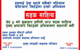 दमौली । गण्डकी वाङ्मय प्रतिष्ठान तनहुँको आयोजनामा भ्रष्टाचार विरुद्ध साहित्यिक अभियान 'सडक साहित्य' कार्यक्रम गरिएको छ। ‘हुनुपर्छ देश लुट्ने सबैको पहिचान, भ्रष्टाचार विरुद्ध हाम्रो अभियान’…